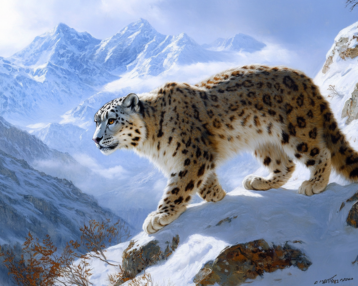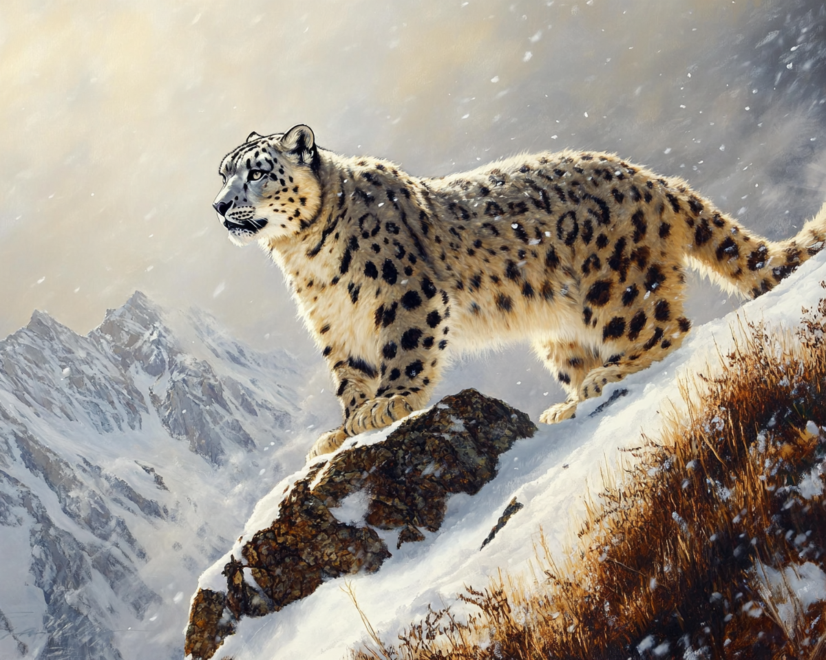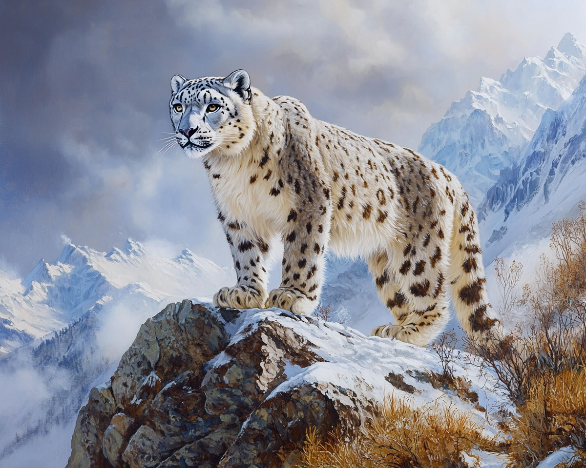 "an oil painting of a snow leopard on a snowy mountain ultra realistic extra wide with enhanced colors "