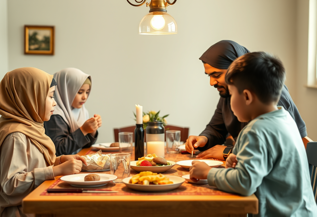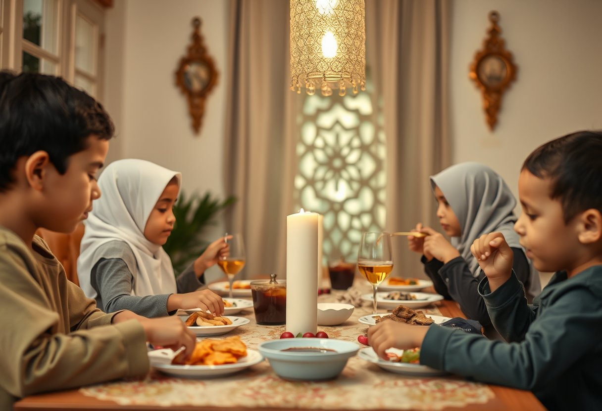 "A picture of Ramadan Muslim Kids and families breaking fast around the dining table as a family"