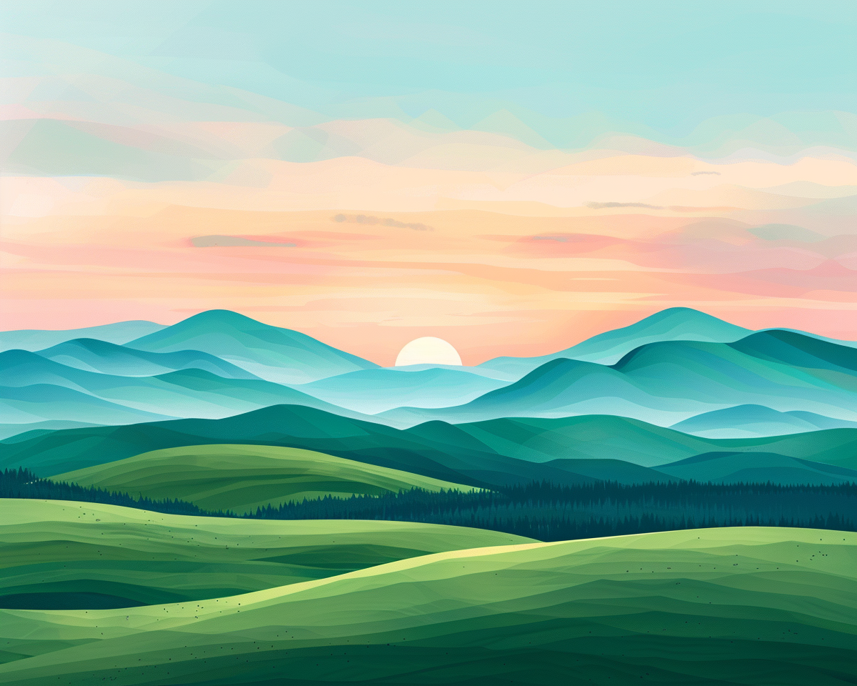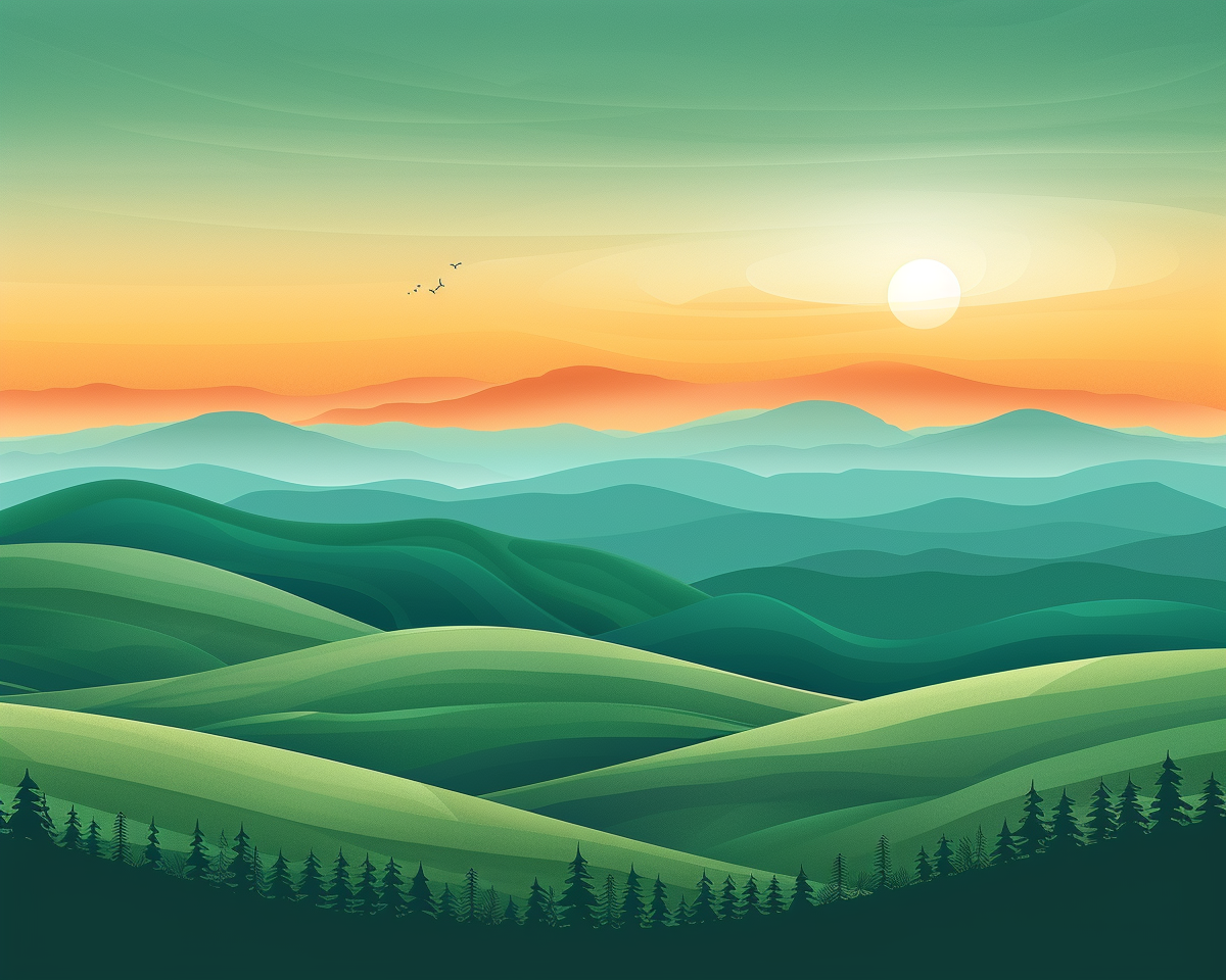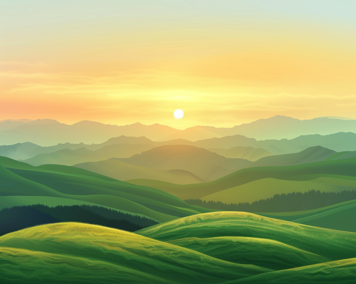 "A picture of green rolling hills with few trees. Add a mountain range in the distance. Space out two mountains and Add a sunset in between them. Emphasize the sunset and the sky. "