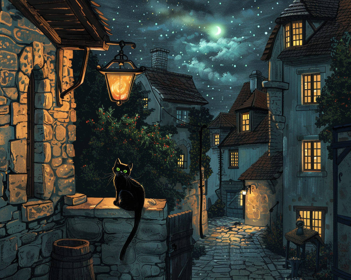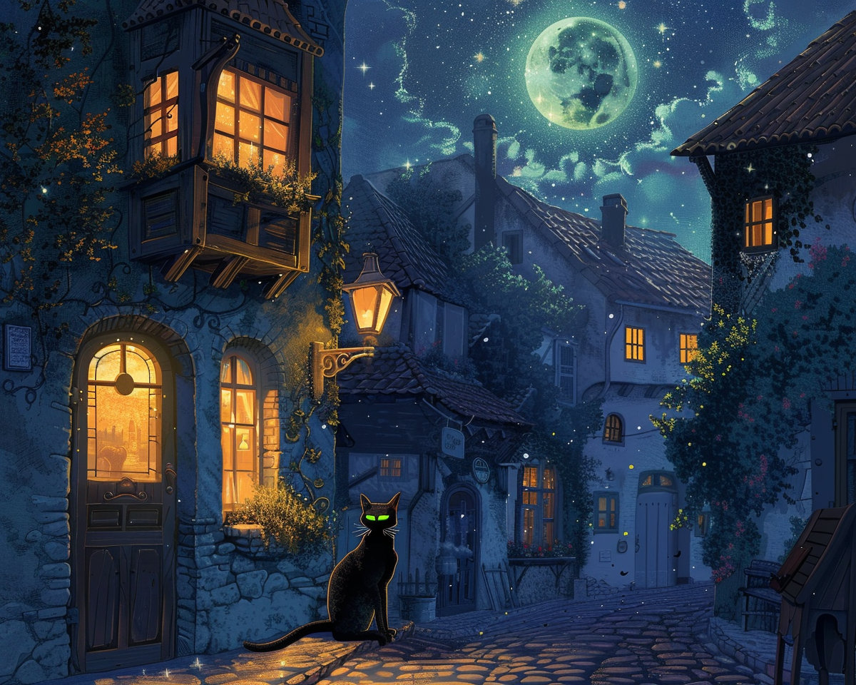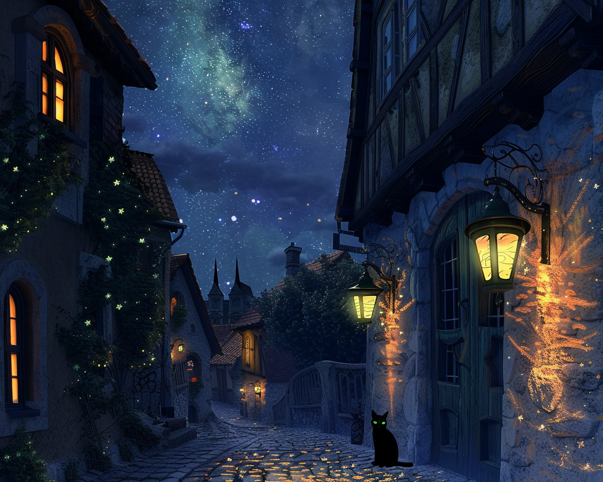 "A serene, moonlit night scene of a quaint, cobblestone village street with vintage lanterns casting a warm, golden glow, inspired by the works of Vincent van Gogh. The sky is dotted with a blanket of shimmering stars. The buildings exhibit charming, old-world European architecture, and a lone, black cat with bright green eyes is perched on a windowsill. The scene is captured through a 35mm lens, with a soft focus that adds a dreamy, ethereal quality to the image."