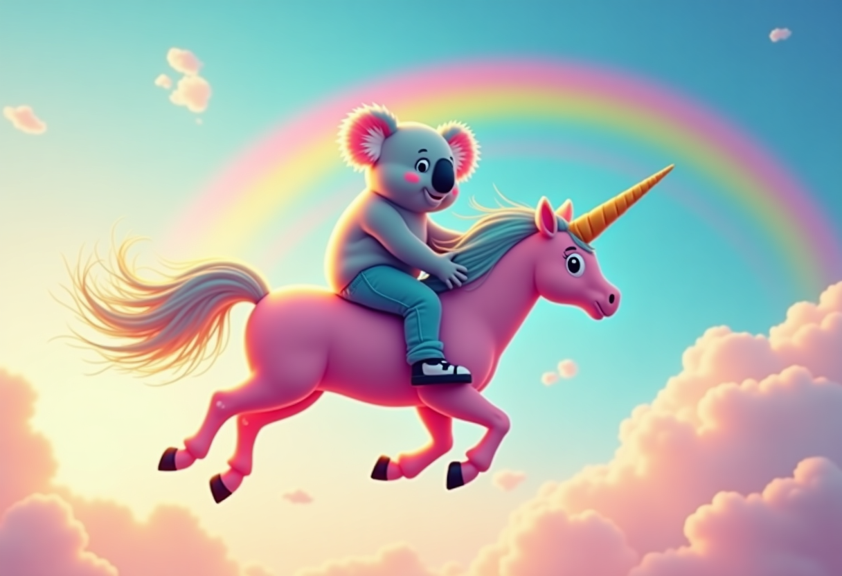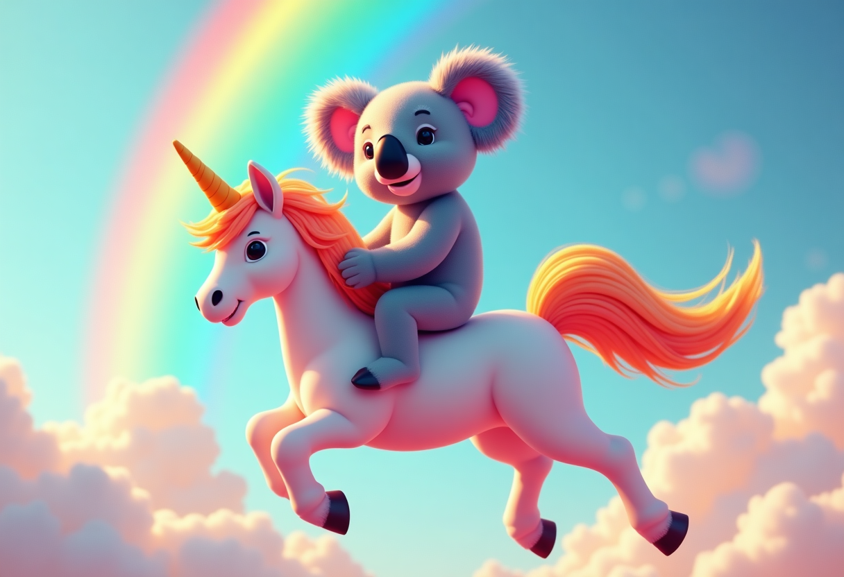 "A koala riding a rainbow unicorn in the sky "