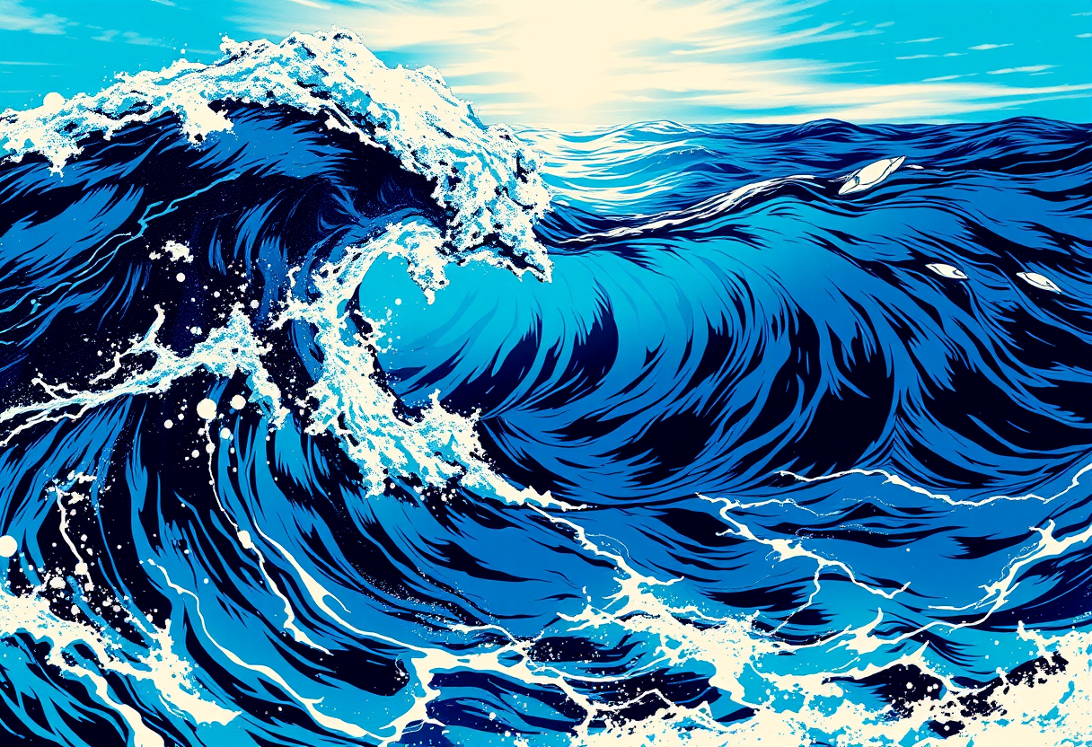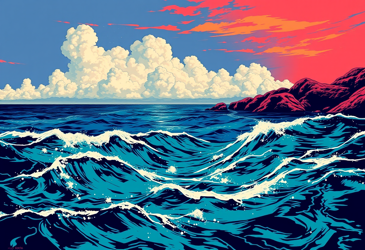 "an ocean seascape, pop art style, bold colors, graphic design, Andy Warhol inspired, high contrast, highly detailed, rich textures, intricate details"