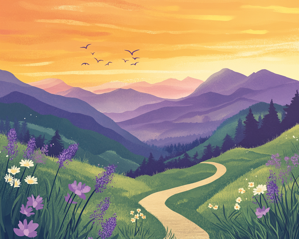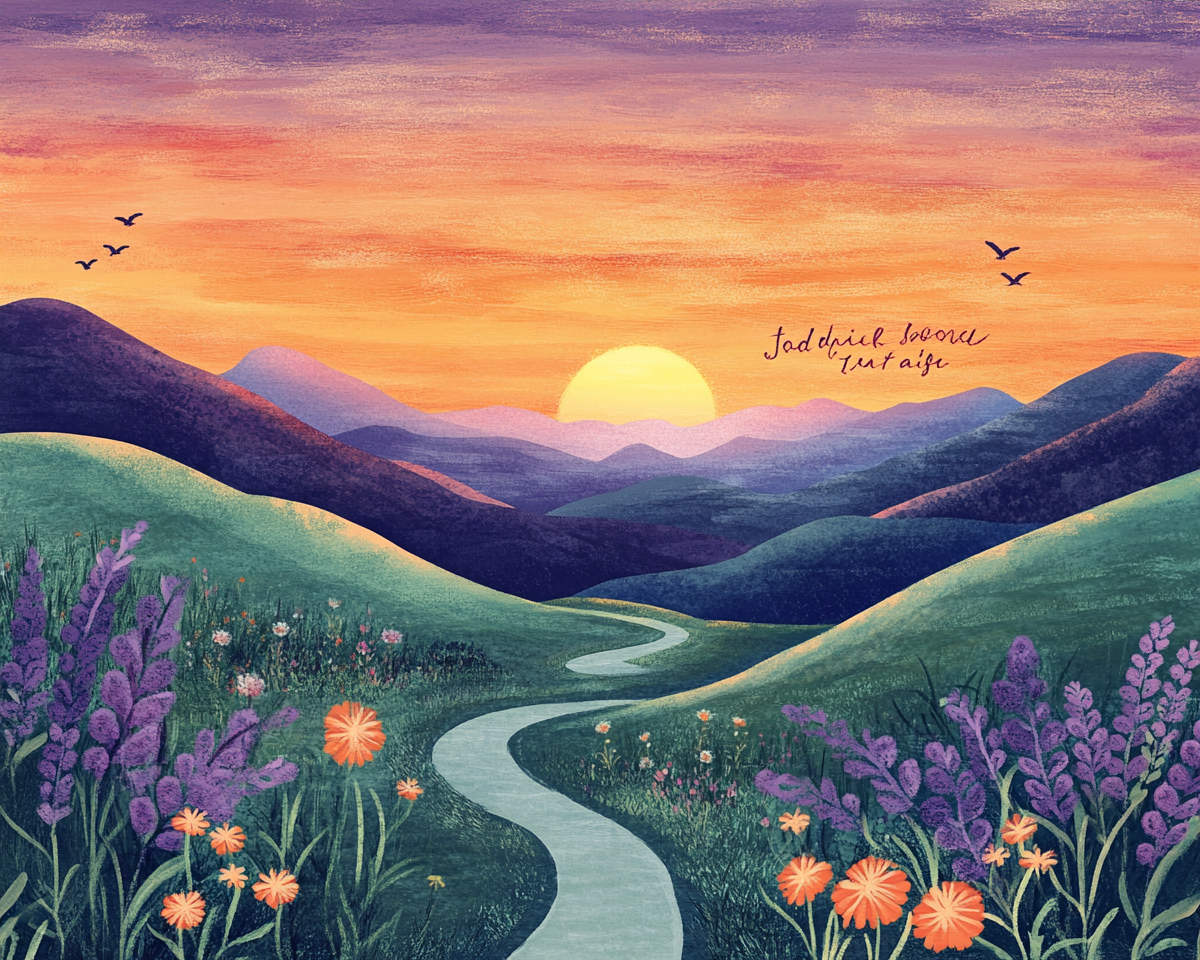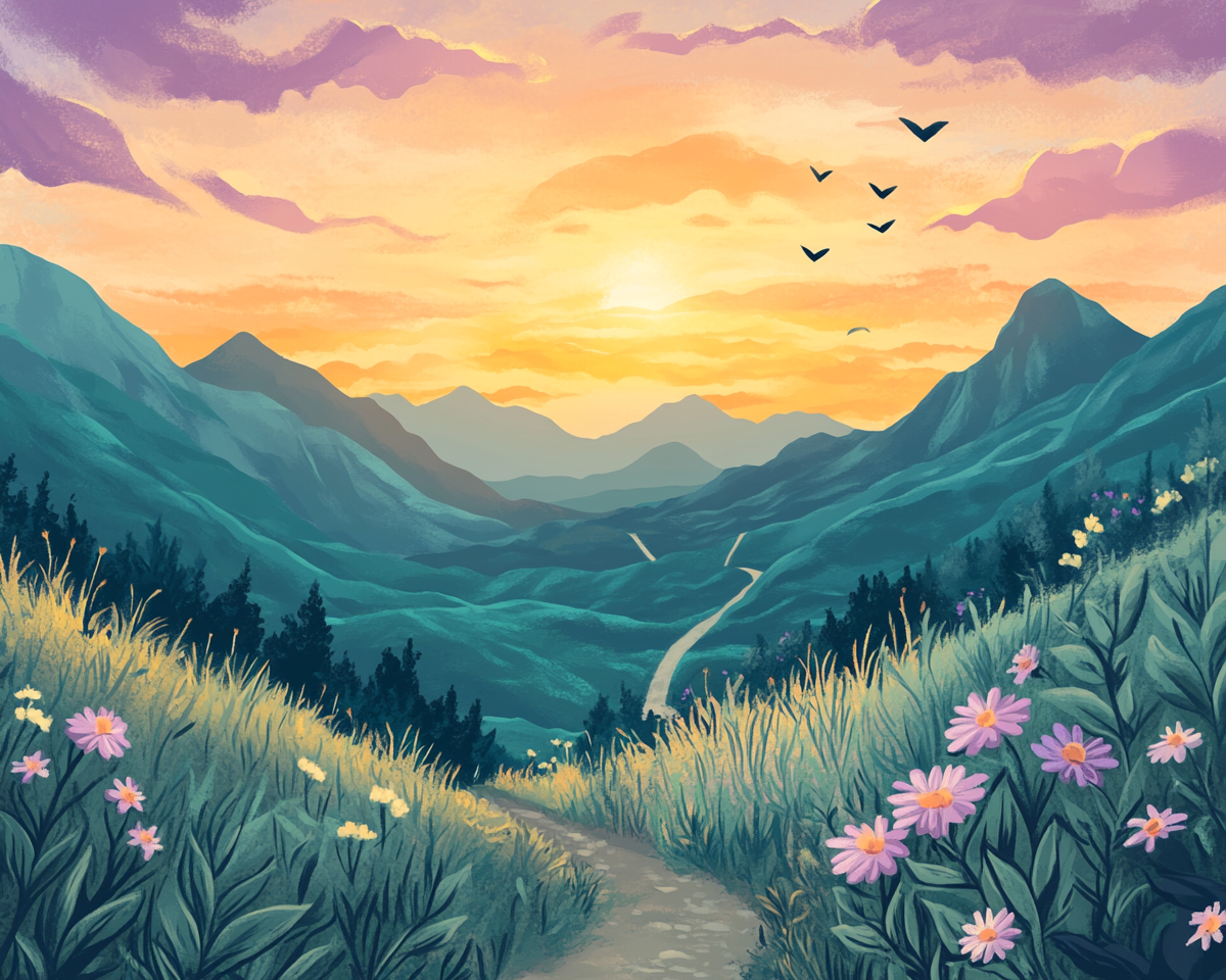 ""Create a vibrant and motivational jigsaw puzzle featuring a serene mountain landscape at sunrise. In the sky, incorporate an inspiring quote like 'The journey is the reward.' Surround the scene with subtle details such as winding paths, blooming flowers, and distant birds to create a sense of calm and progress. Use a soft, warm color palette with shades of orange, purple, and green to evoke a feeling of peace and self-reflection"