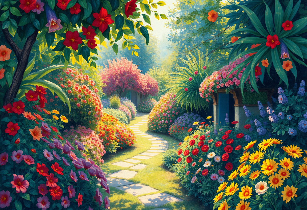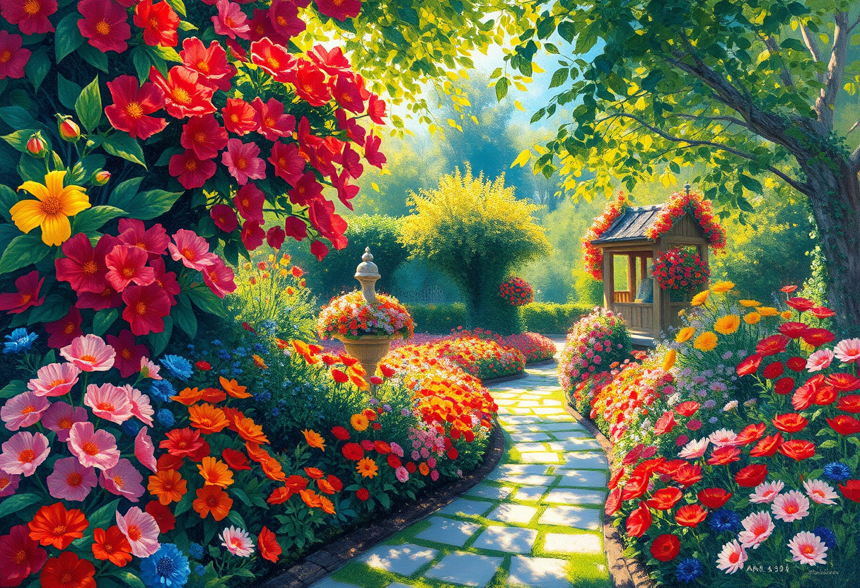 "a lush garden with flowers, impressionist painting style, visible brushstrokes, light and color emphasis, Monet-inspired, highly detailed, rich textures, intricate details"