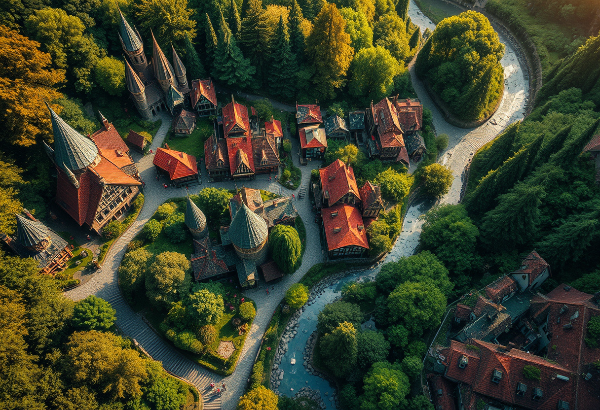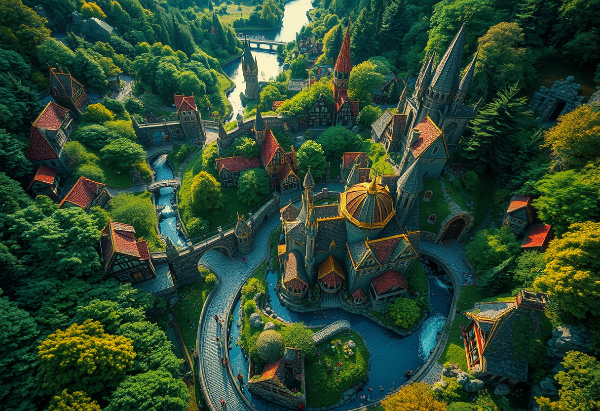 I would like it to be based on a magical land similar to Harry potter. I would like it to be an aerial view of Hogwarts with the surrounding areas magical suburbs, aerial drone photography, bird's eye view, stunning top-down perspective, ultra wide angle, dramatic lighting, high contrast, deep shadows, vibrant saturated colors, high color contrast, highly detailed, rich textures, intricate details"