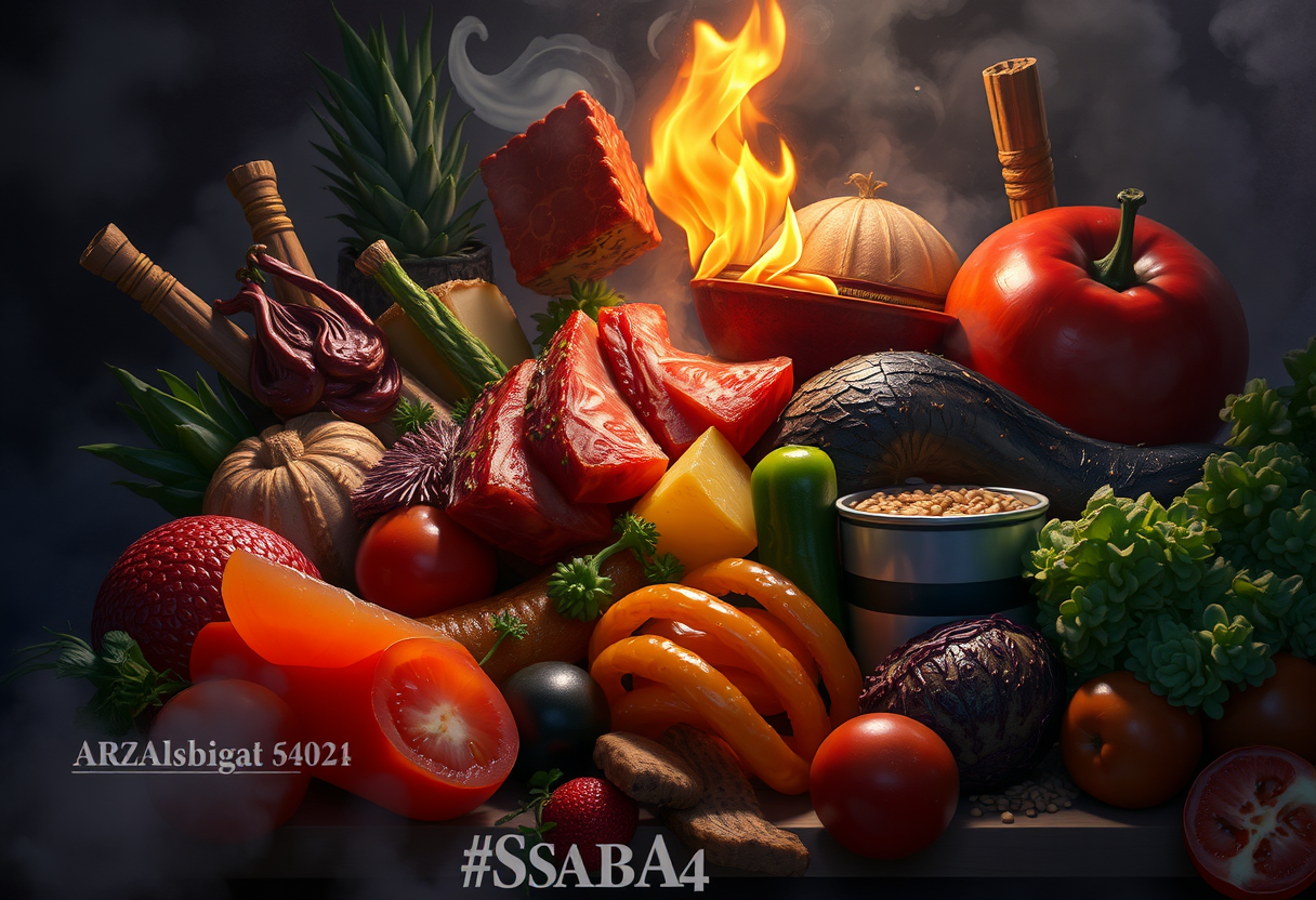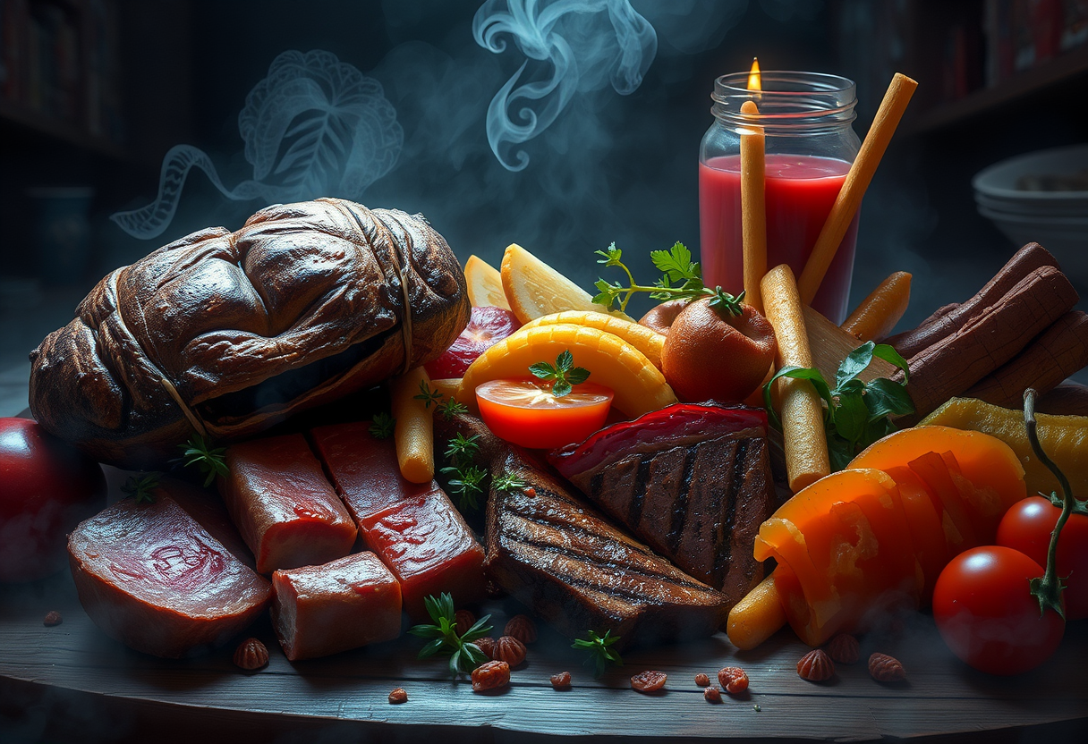 "a delicious food arrangement, digital art, trending on artstation, highly detailed digital illustration, vibrant colors, moody atmospheric lighting, misty, dark tones, highly detailed, rich textures, intricate details"