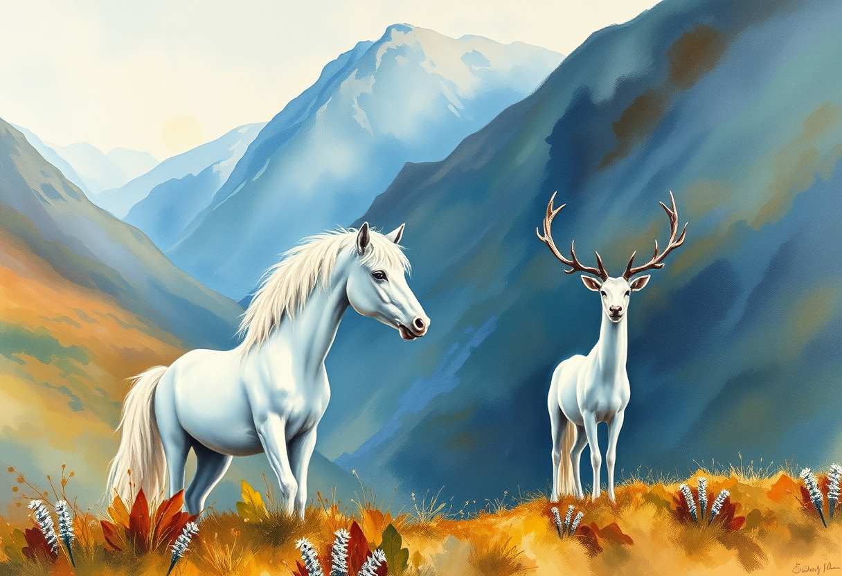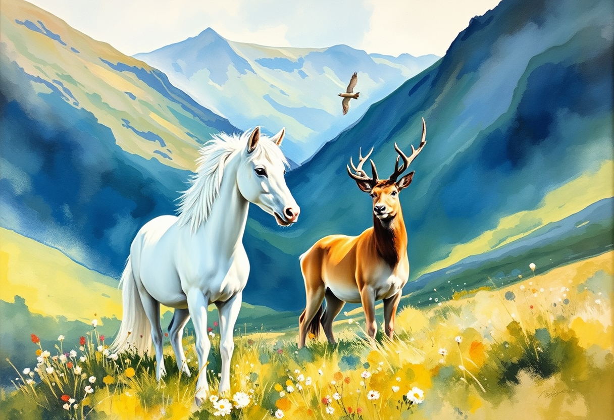 "White unicorn and stag in Scottish glen, oil painting style, rich thick brushstrokes, classical fine art, museum quality oil on canvas, vibrant bright lighting, saturated vivid colors, highly detailed, rich textures, intricate details, impressionist painting style, visible brushstrokes, light and color emphasis, Monet-inspired, vibrant bright lighting, saturated vivid colors, highly detailed, rich textures, intricate details, watercolor painting style, soft flowing colors, delicate brushstrokes, artistic watercolor technique, natural daylight, clear and balanced lighting, highly detailed, rich textures, intricate details"