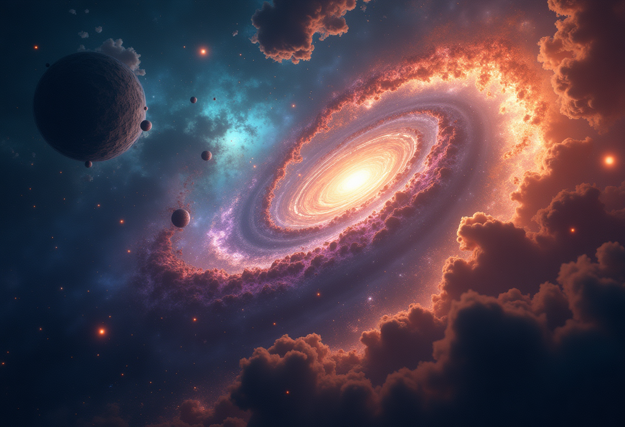 "a cosmic outer space scene, cinematic photography, dramatic lighting, film still, anamorphic lens, color graded, 8k uhd, dramatic lighting, high contrast, deep shadows, earthy natural color palette, browns greens and warm neutrals, highly detailed, rich textures, intricate details"