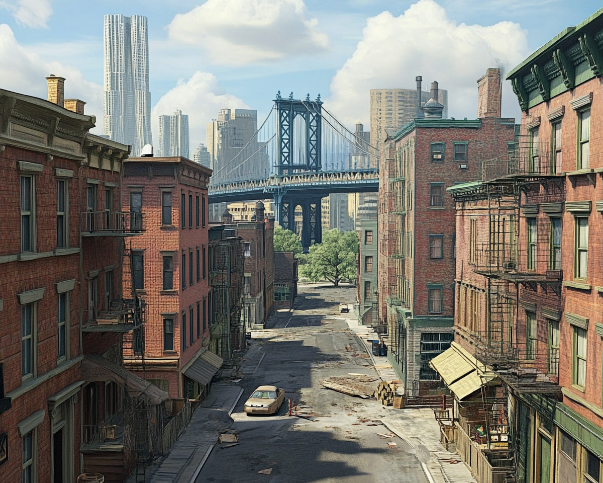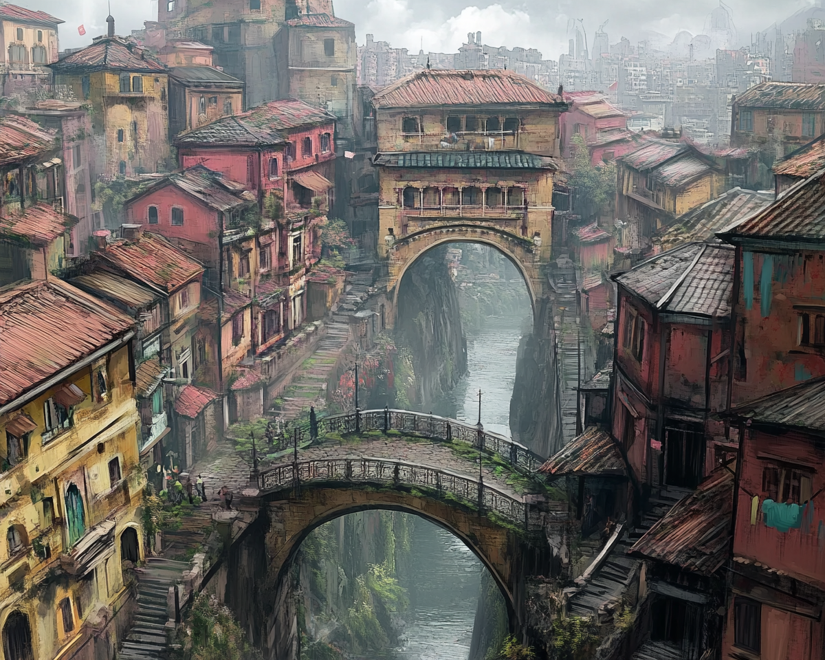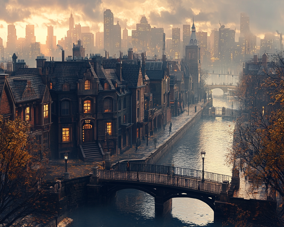 "make a realistic urban landscape with houses bridges streets"