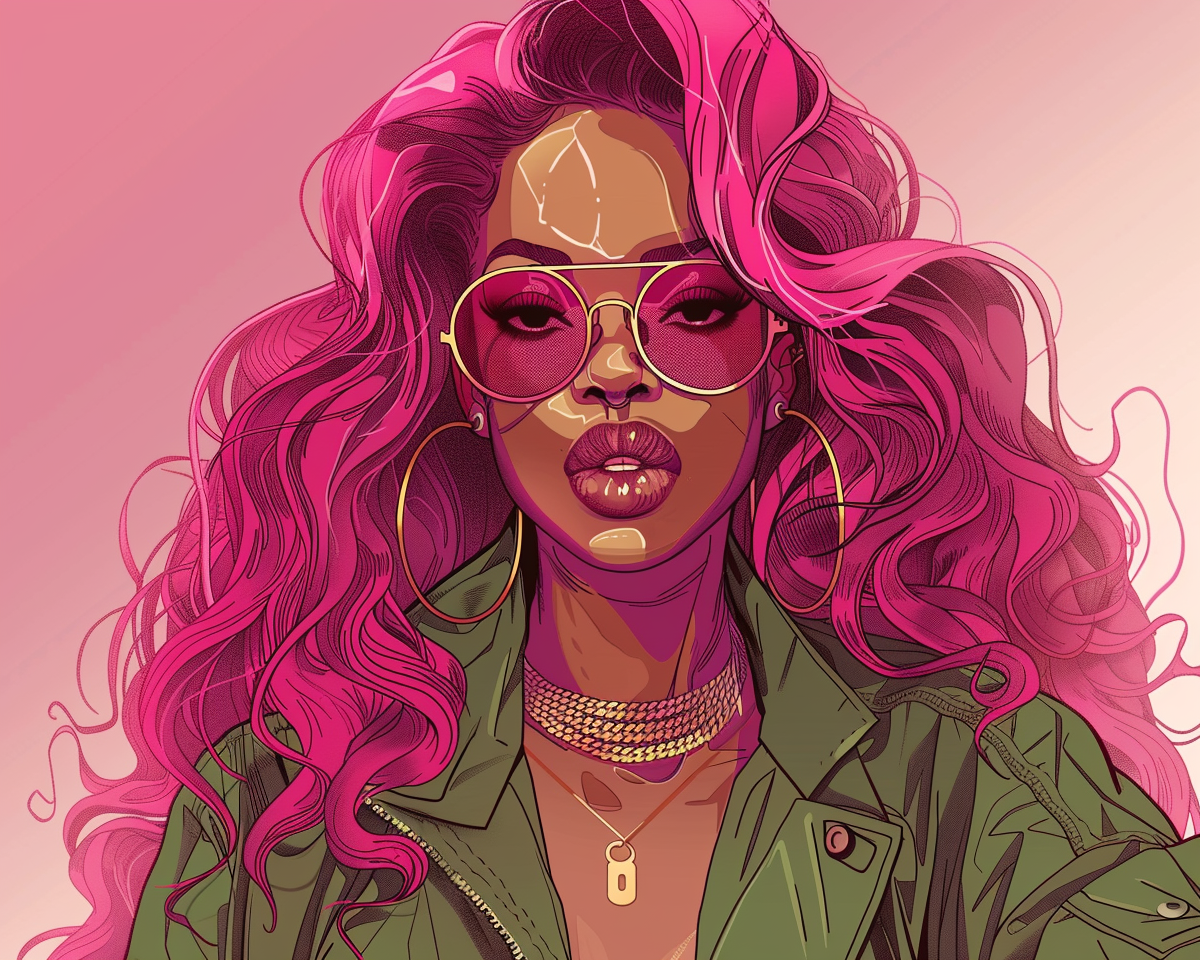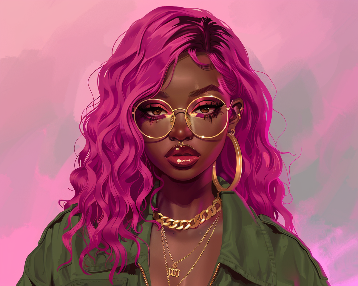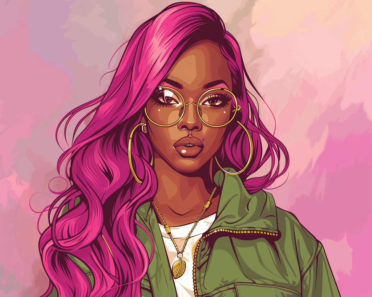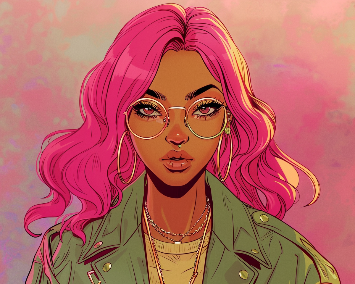 "A high-quality cartoonish portrait of a young Nubian woman with a surprising new hairstyle. She has vibrant, glossy pink hair styled in elegant, long waves that cascade over her shoulders. Features include large, expressive brown eyes behind fashionable gold-rimmed glasses, and full lips lightly tinted with soft pink. She wears a stylish olive green bomber jacket adorned with gold accessories, including large hoop earrings and layered necklaces. The background is a gradient of soft pinks and purples, creating a modern and chic cartoon style look."