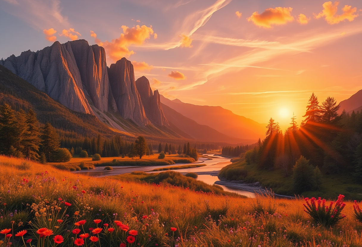 "a beautiful landscape scene, golden hour photography, warm sunset light, soft golden glow, magic hour, beautiful natural lighting, highly detailed, rich textures, intricate details"