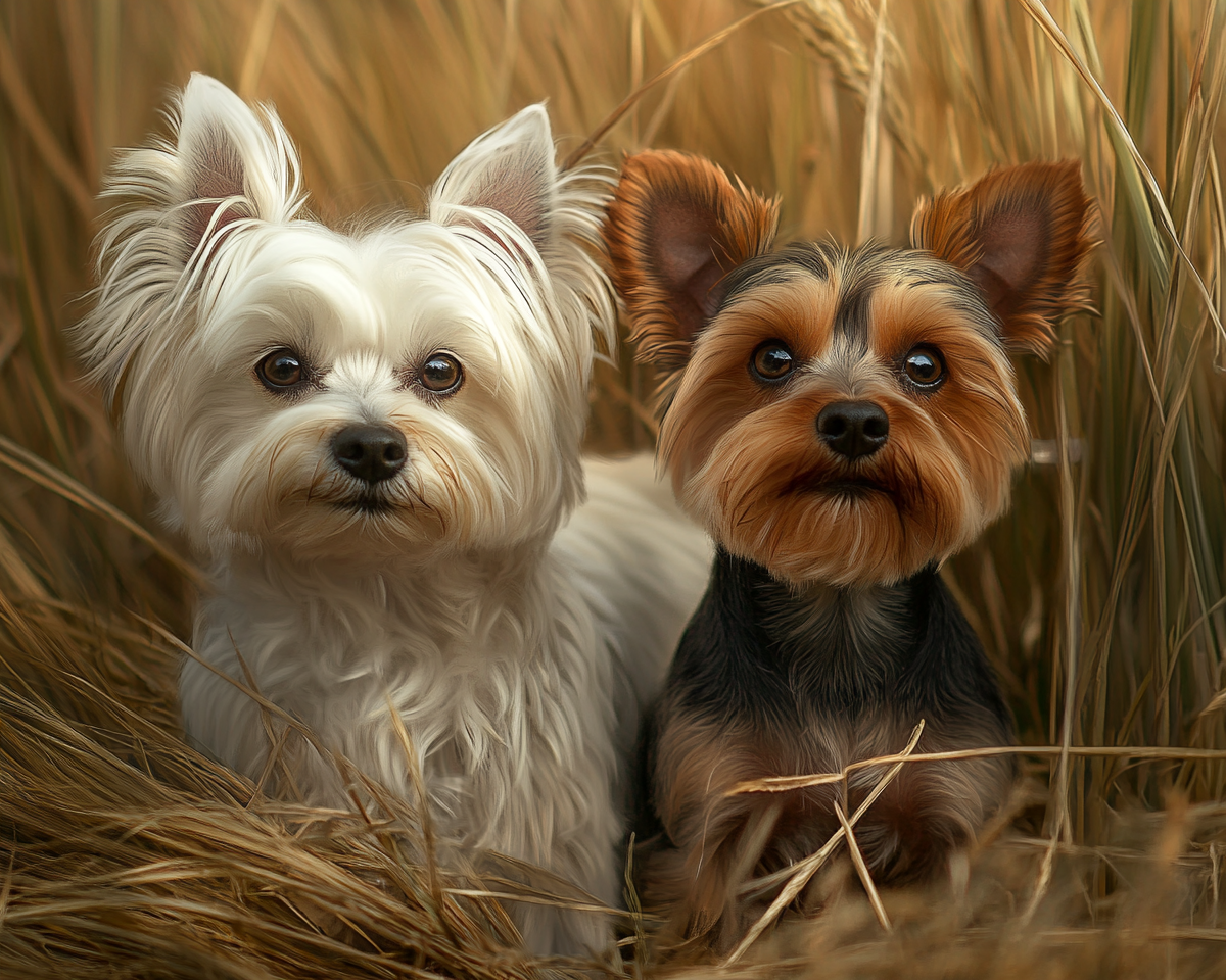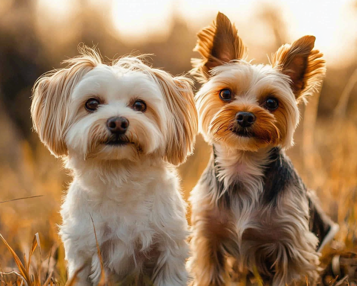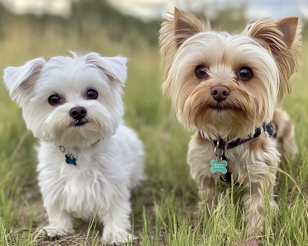 "A picture of a white maltese and brown Yorkie dog in a field"