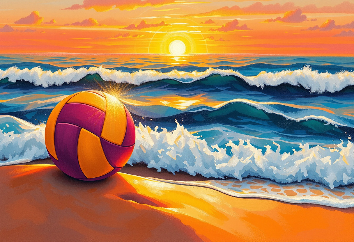 "Sunset with a volleyball and waves pushing on sure, golden hour photography, warm sunset light, soft golden glow, magic hour, beautiful natural lighting, highly detailed, rich textures, intricate details, impressionist painting style, visible brushstrokes, light and color emphasis, Monet-inspired, highly detailed, rich textures, intricate details"