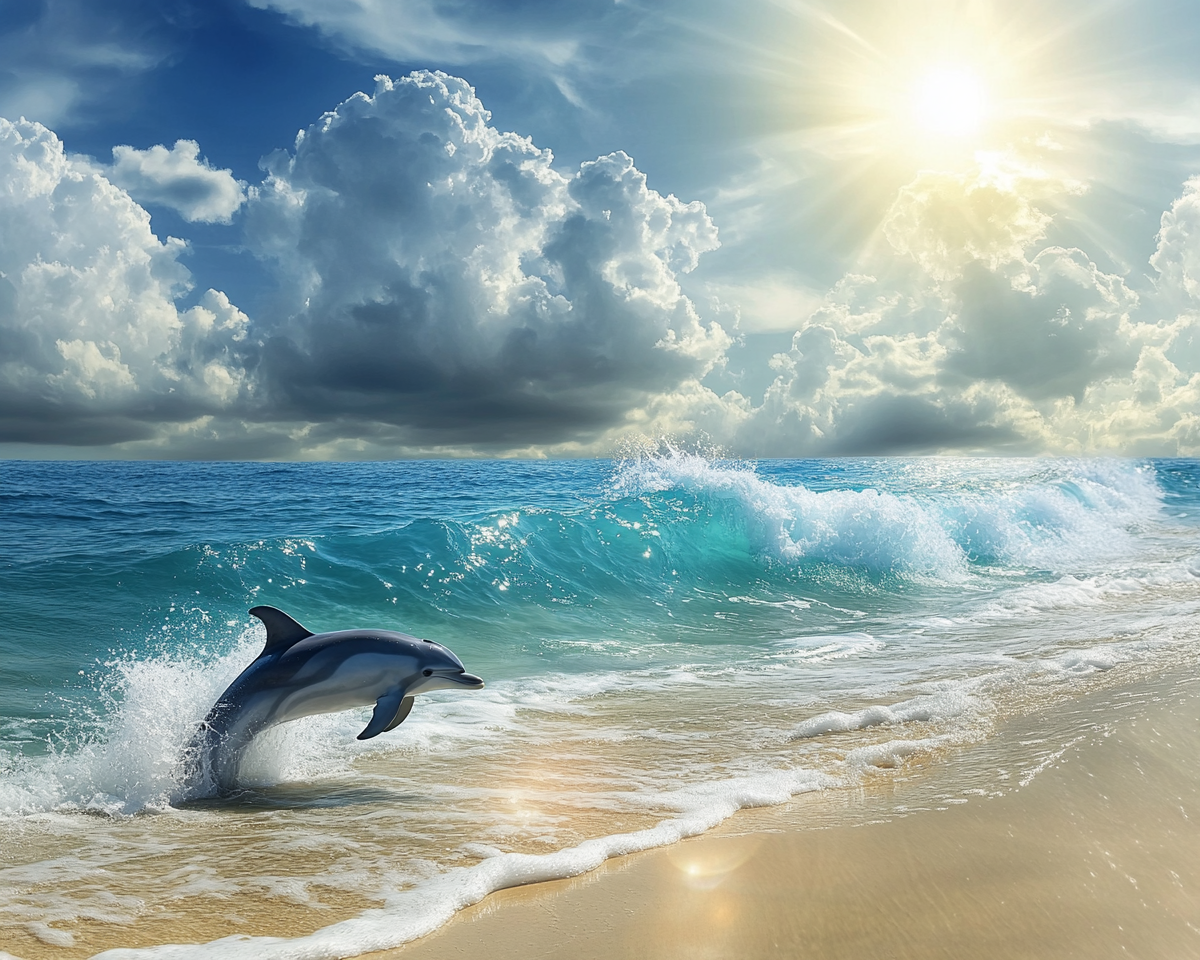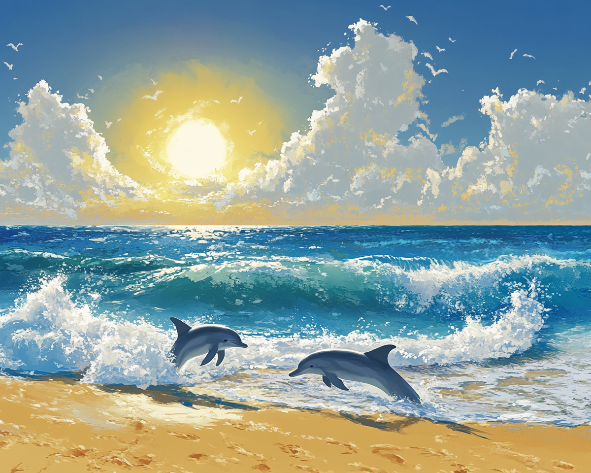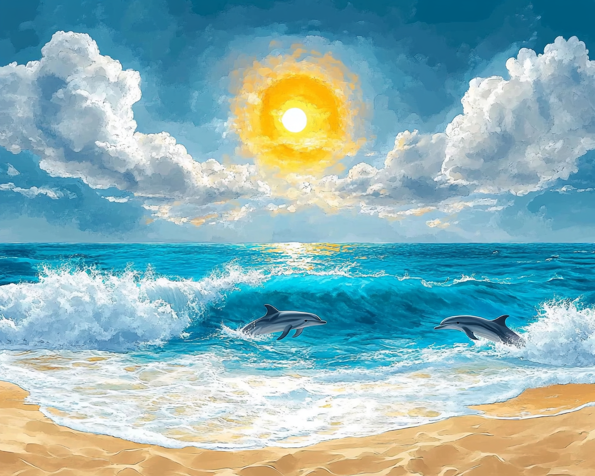 "A blue beach, golden sand, yellow sun, waves crashing, grey dolphins, white marshmallow clouds "