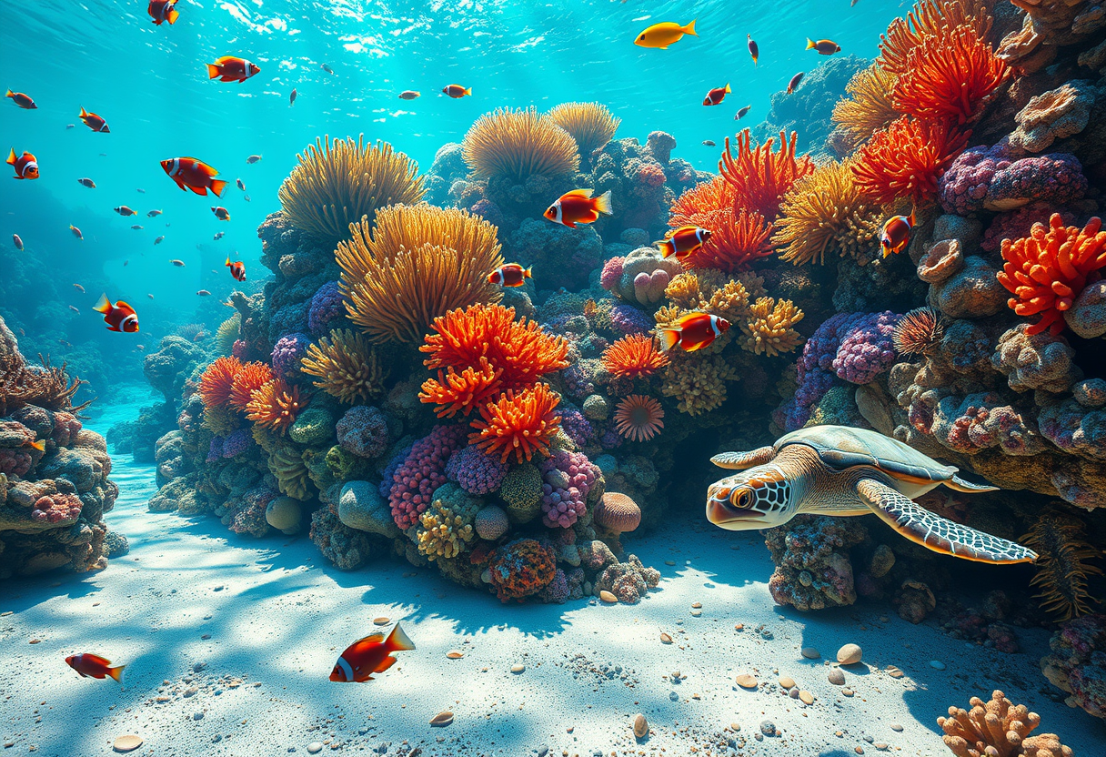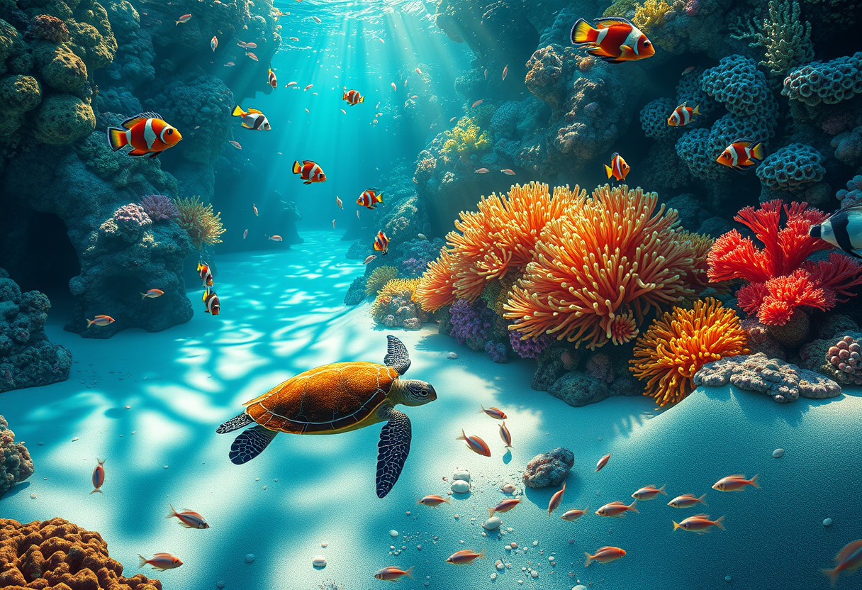 "A vibrant underwater scene teeming with life, showcasing a coral reef bursting with color. Brightly colored fish dart among intricate coral formations, while delicate sea anemones sway gently with the currents. Sunlight filters through the water, creating shimmering patterns on the sandy ocean floor. A playful sea turtle glides gracefully in the foreground, surrounded by schools of tiny, iridescent fish. The rich blues and greens of the water contrast with the warm oranges, pinks, and yellows of the coral. The scene is rendered in a detailed, realistic style, capturing the enchanting beauty and diversity of marine life, evoking a sense of wonder and tranquility."