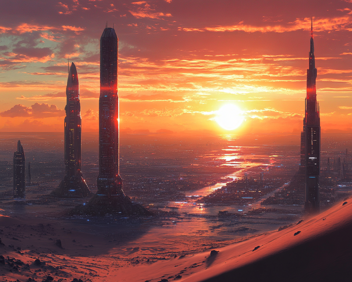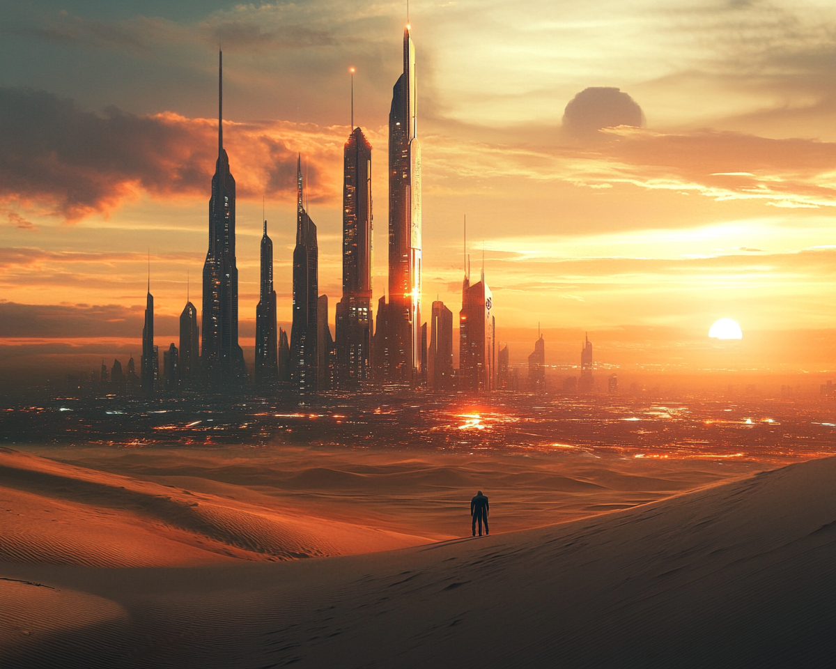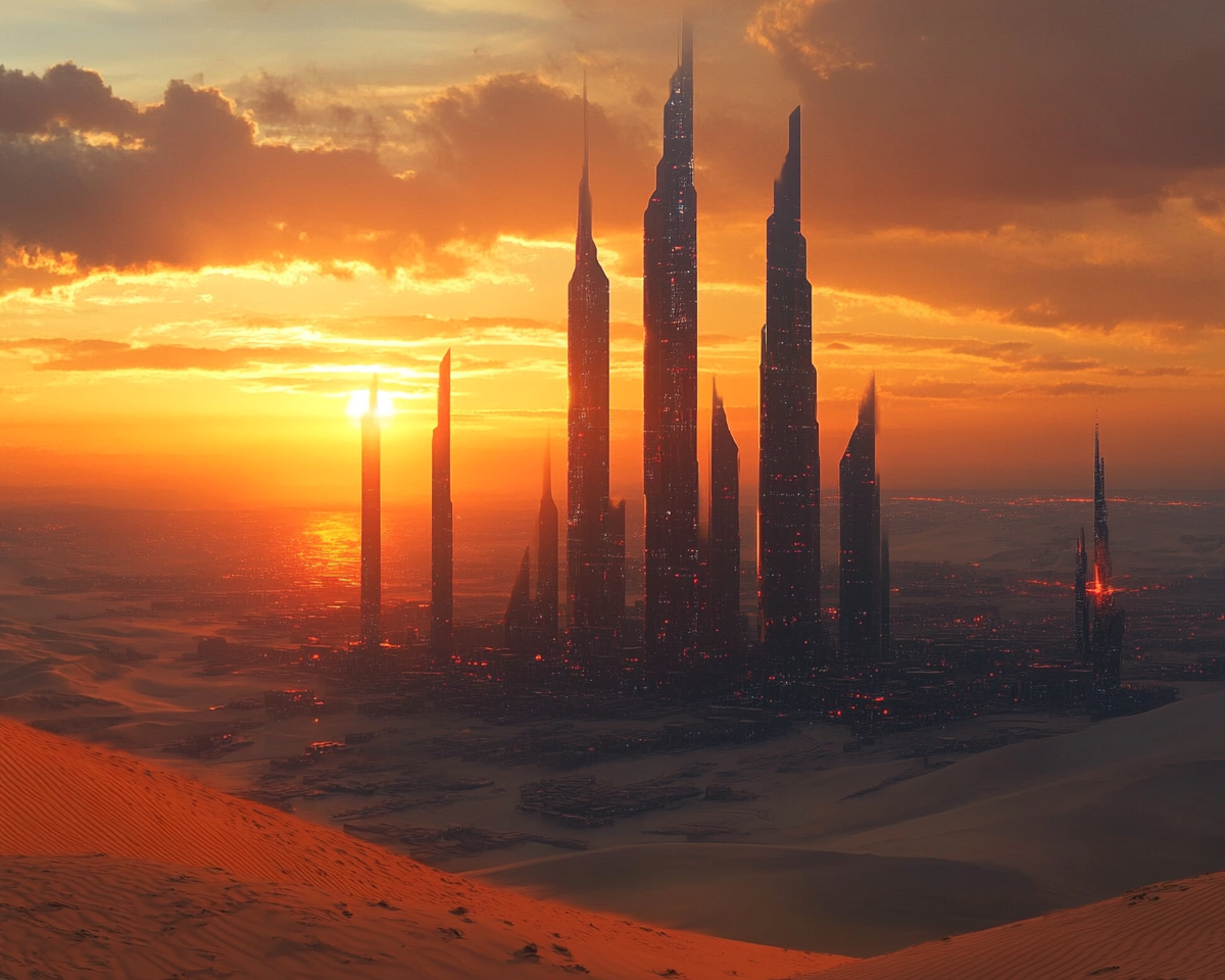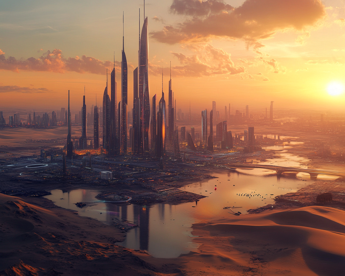 "a depiction of a futuristic world that captures an awe-inspiring skyline at sunset, blending advanced technology with nature. The atmosphere reflects the serene yet vibrant essence of a city where innovation and beauty coexist in the Sahara desert"