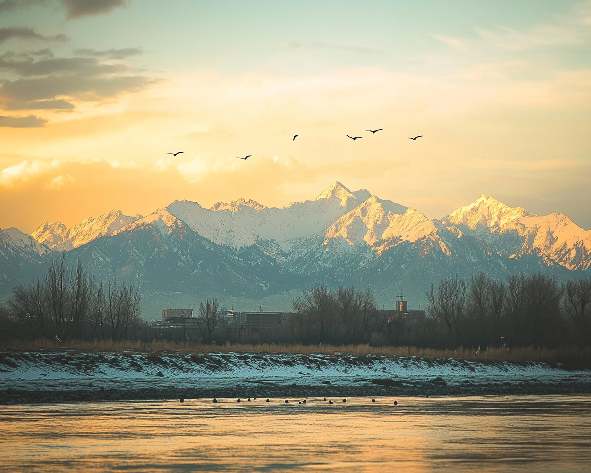 "The mountains of salt lake city with a sunset in the background and a few birds in the far distance"