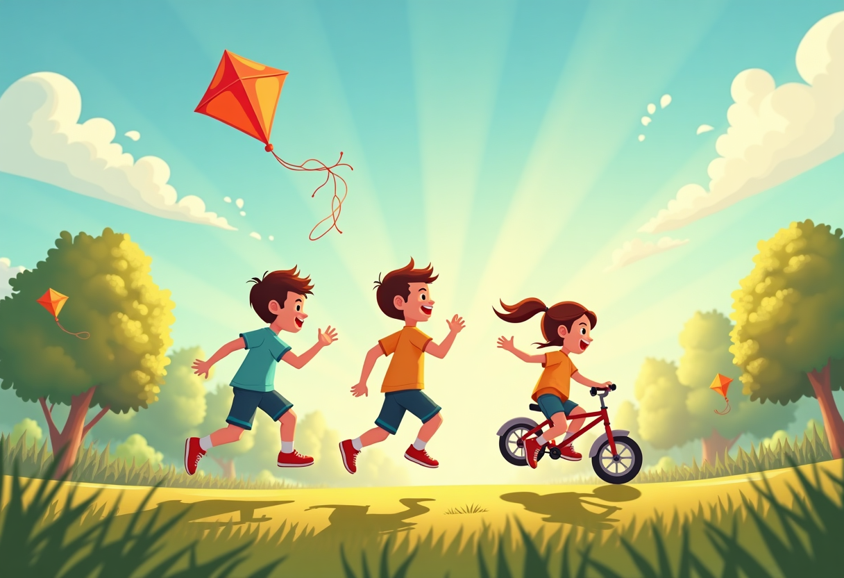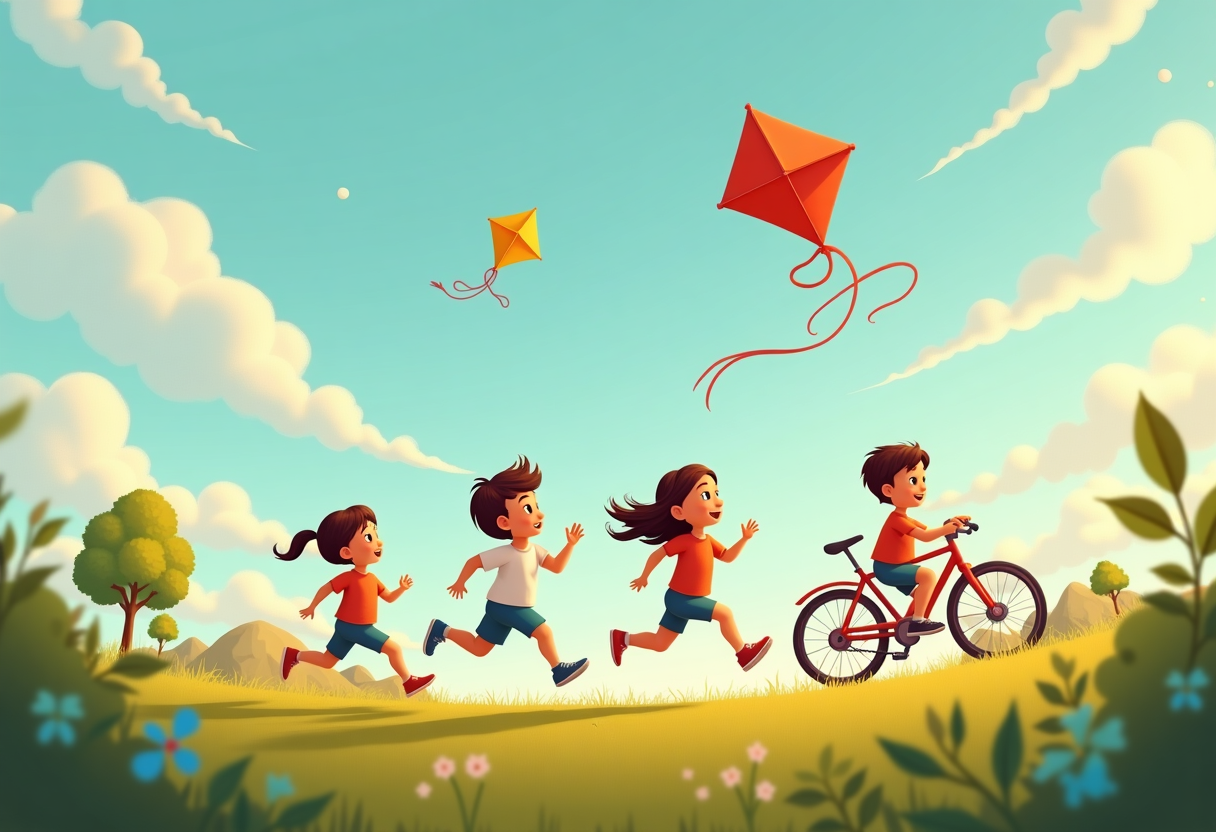 "A picture of play ground with children running , jumping, swing, cycling, flying kite"