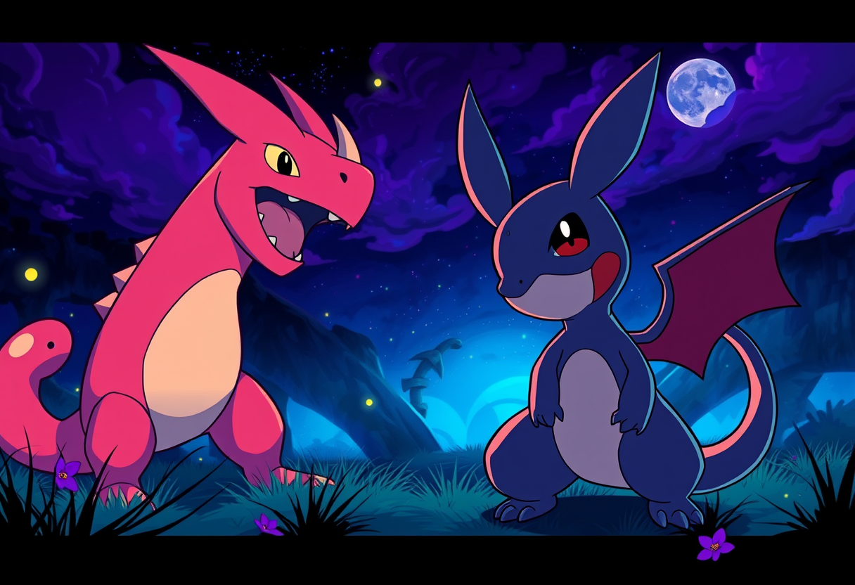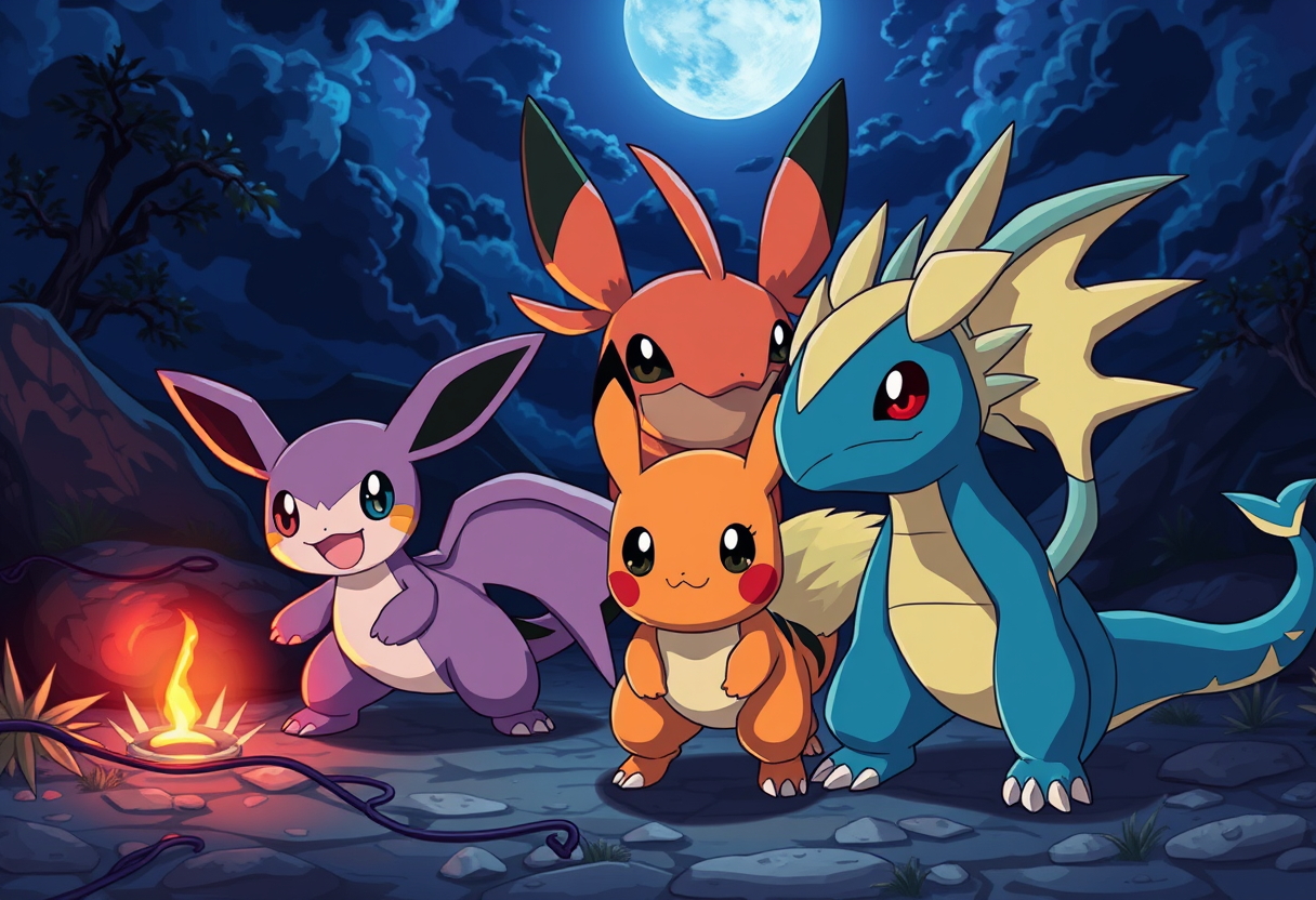 "Pokemon inspired dark rhemed , cartoon style illustration, vibrant colors, fun and playful, clean bold lines, animated movie quality, dramatic lighting, high contrast, deep shadows, highly detailed, rich textures, intricate details, anime art style, Studio Ghibli inspired, beautiful anime illustration, detailed anime scenery, dramatic lighting, high contrast, deep shadows, highly detailed, rich textures, intricate details"