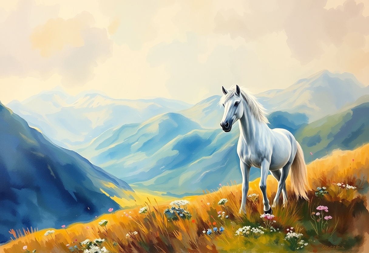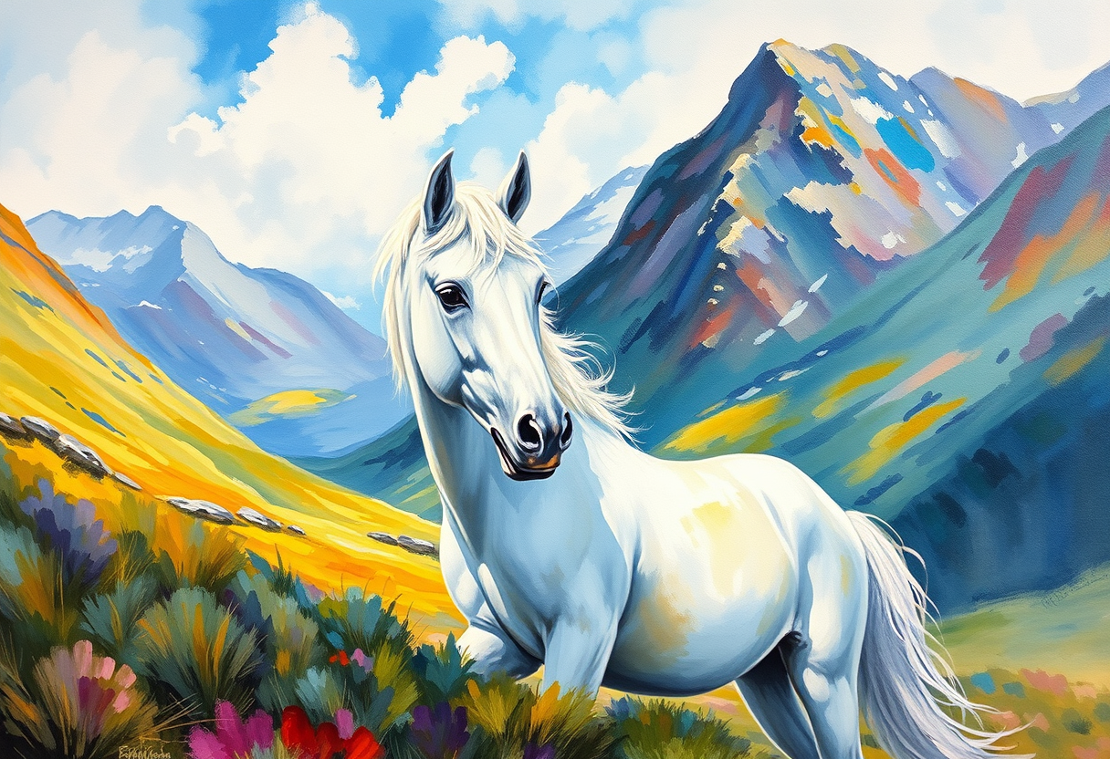 "White Unicorn and Scottish glen, oil painting style, rich thick brushstrokes, classical fine art, museum quality oil on canvas, vibrant bright lighting, saturated vivid colors, highly detailed, rich textures, intricate details, impressionist painting style, visible brushstrokes, light and color emphasis, Monet-inspired, vibrant bright lighting, saturated vivid colors, highly detailed, rich textures, intricate details, watercolor painting style, soft flowing colors, delicate brushstrokes, artistic watercolor technique, natural daylight, clear and balanced lighting, highly detailed, rich textures, intricate details"