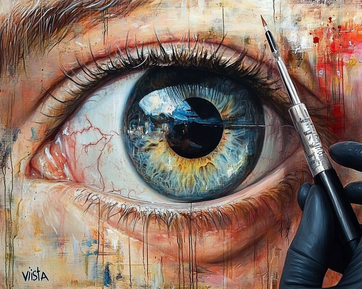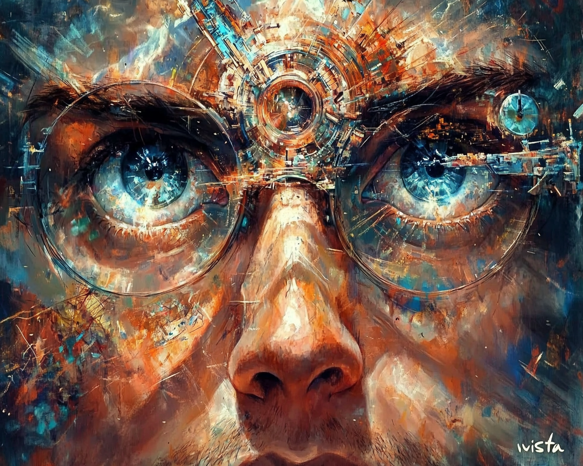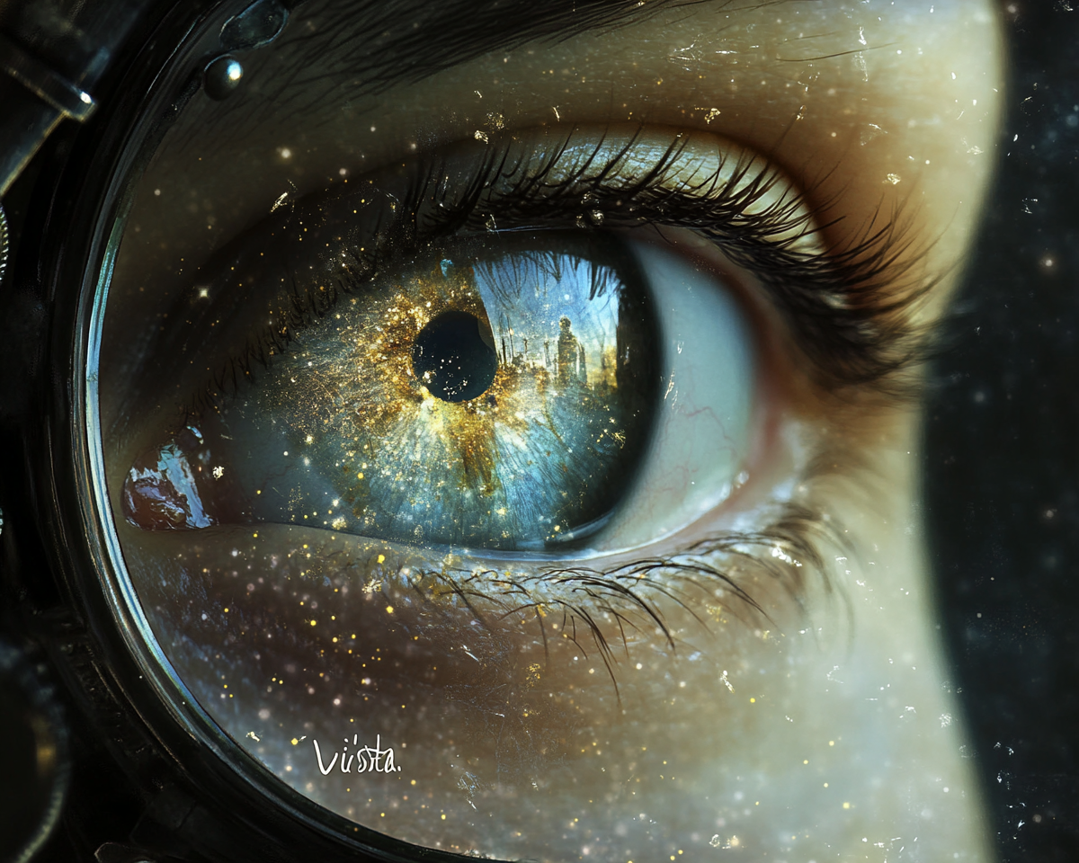 "Usa esta imagen para generar un arte, que sea ese mismo rostro de la imagen, senalando sus ojos, para hacer referencia a la "VISTA". pon un ESPEJO, MICROSCOPIO, DOS OJOS, VISTA, "