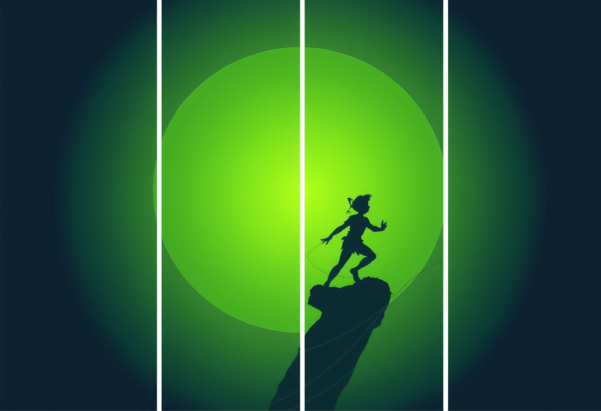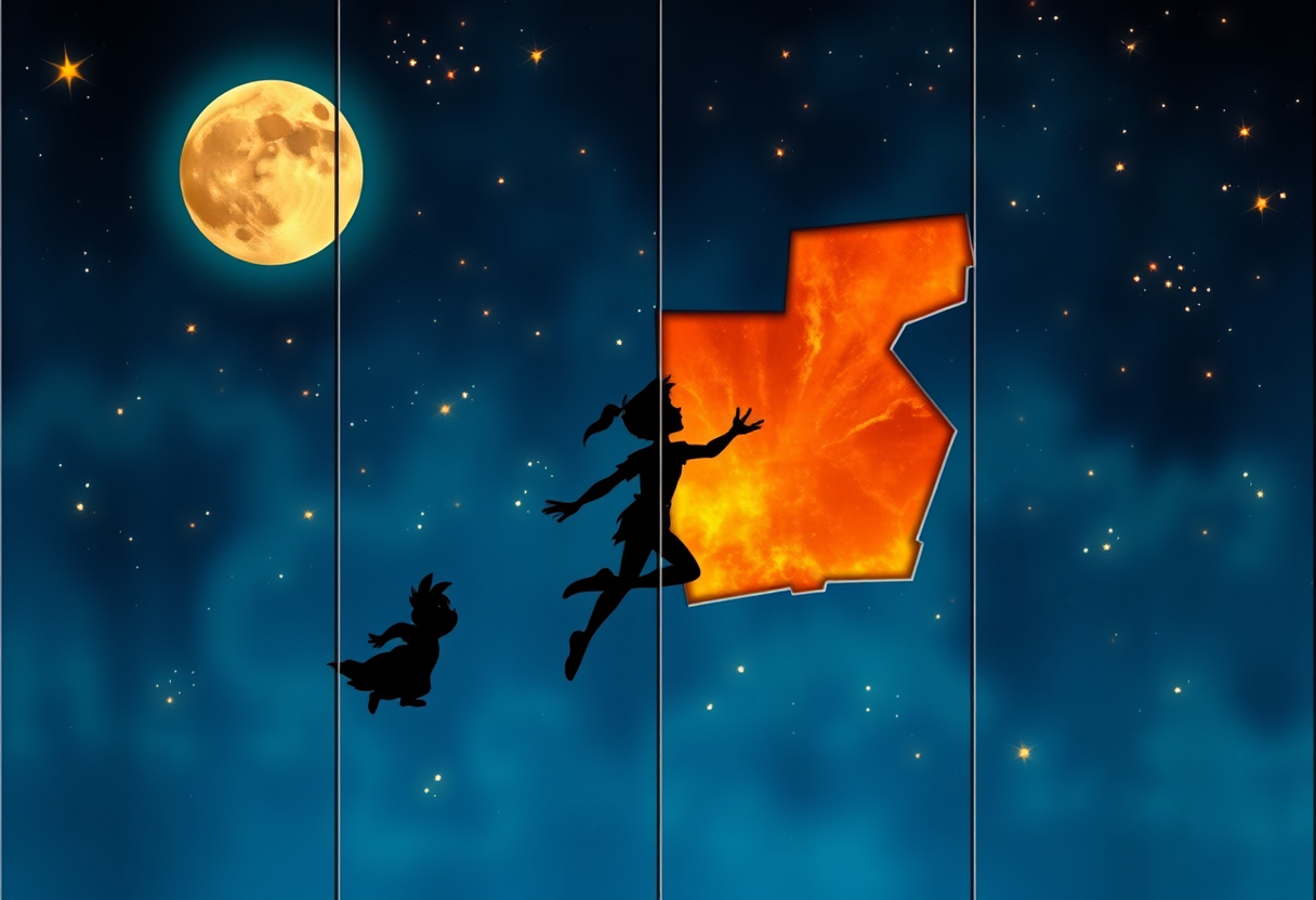 "créer un puzzle de 4-5 pièces non égales sur le thème de Peter Pan à perdu son ombre avec une pièce avec la forme de l'ombre de Peter Pan "
