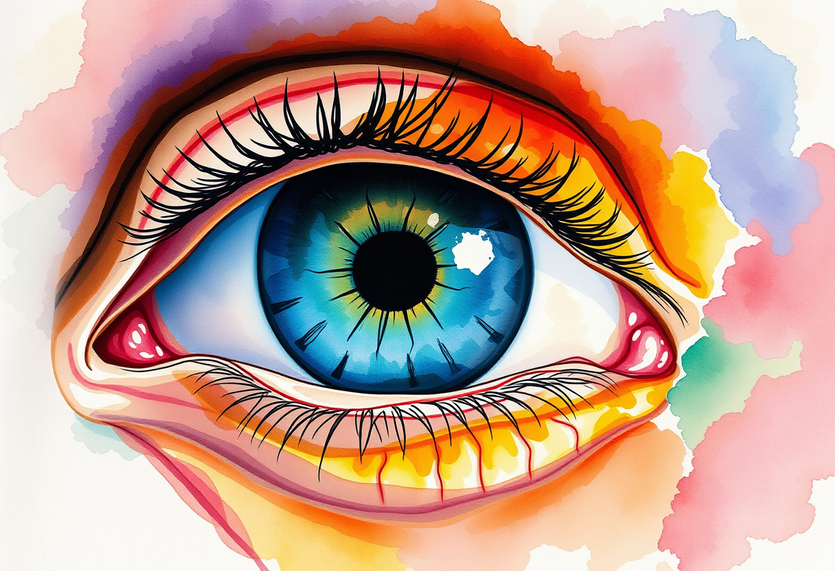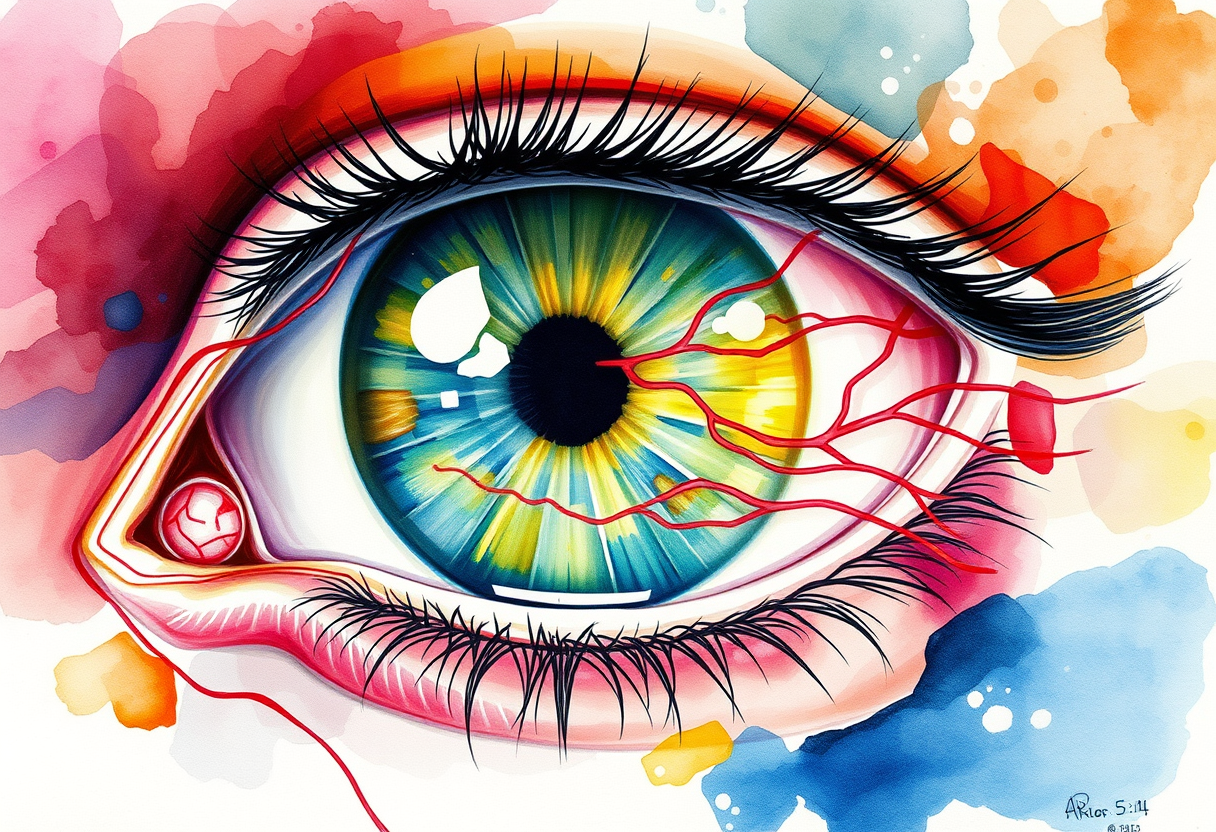 "Clinical anatomy of eye and adnexa , watercolor painting style, soft flowing colors, delicate brushstrokes, artistic watercolor technique, vibrant saturated colors, high color contrast, highly detailed, rich textures, intricate details"