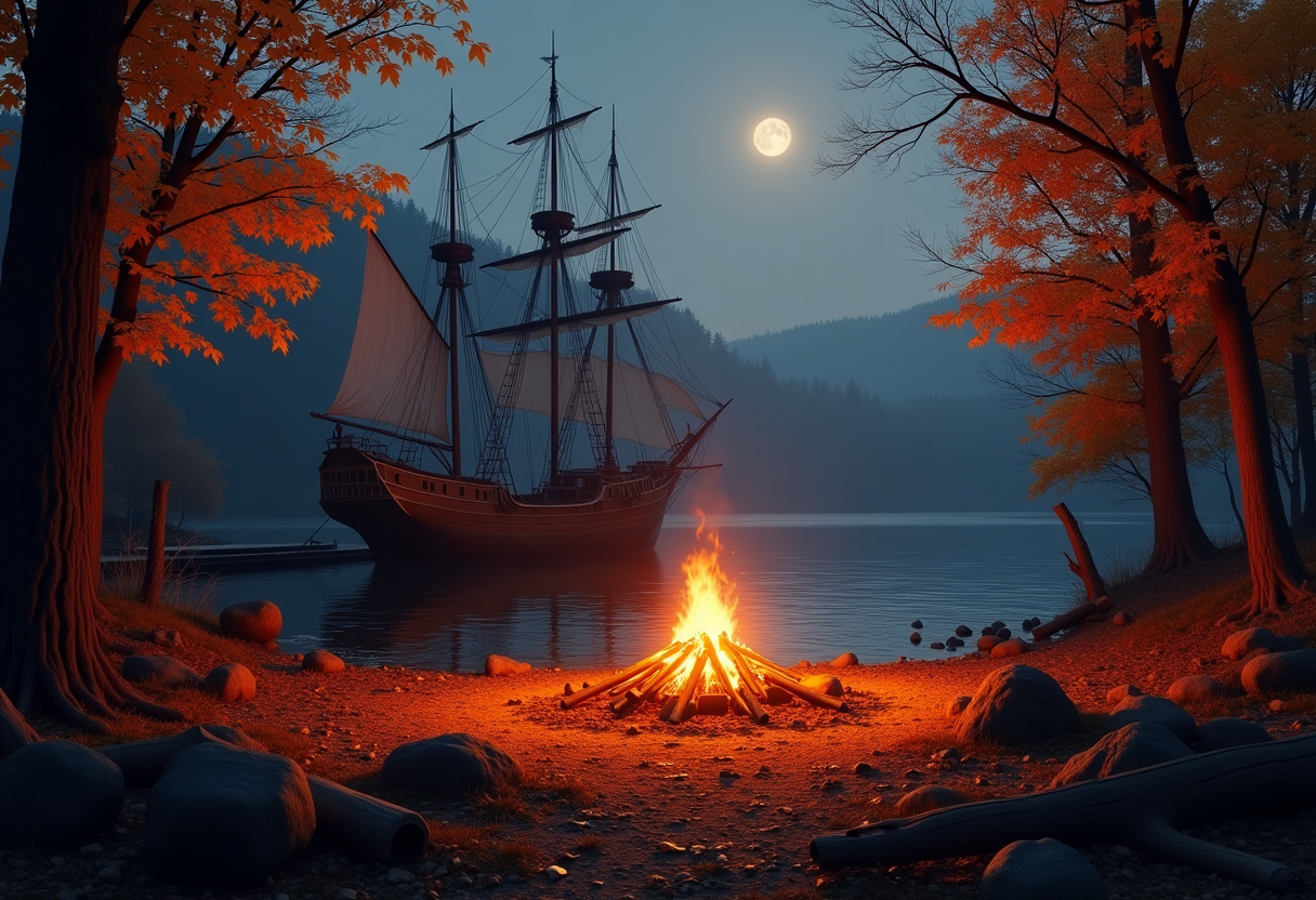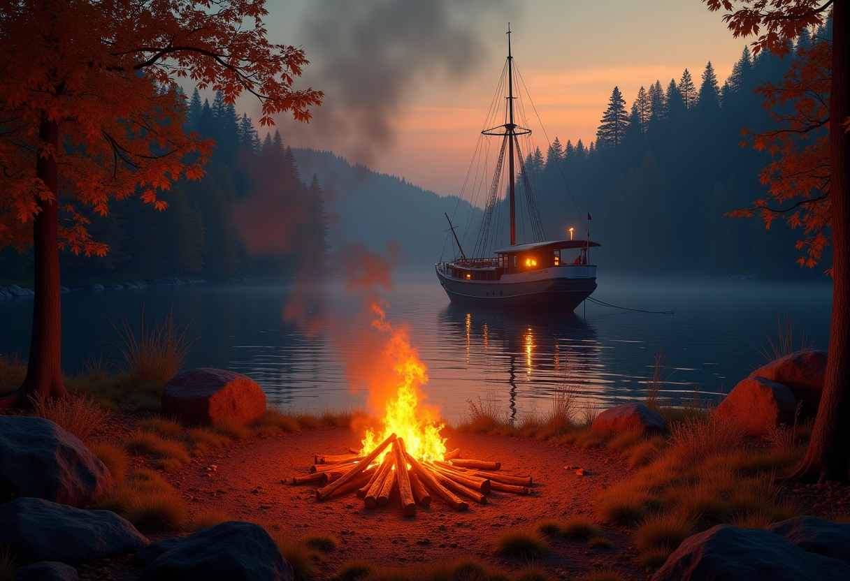 "A ship in front of campfire in autumn"