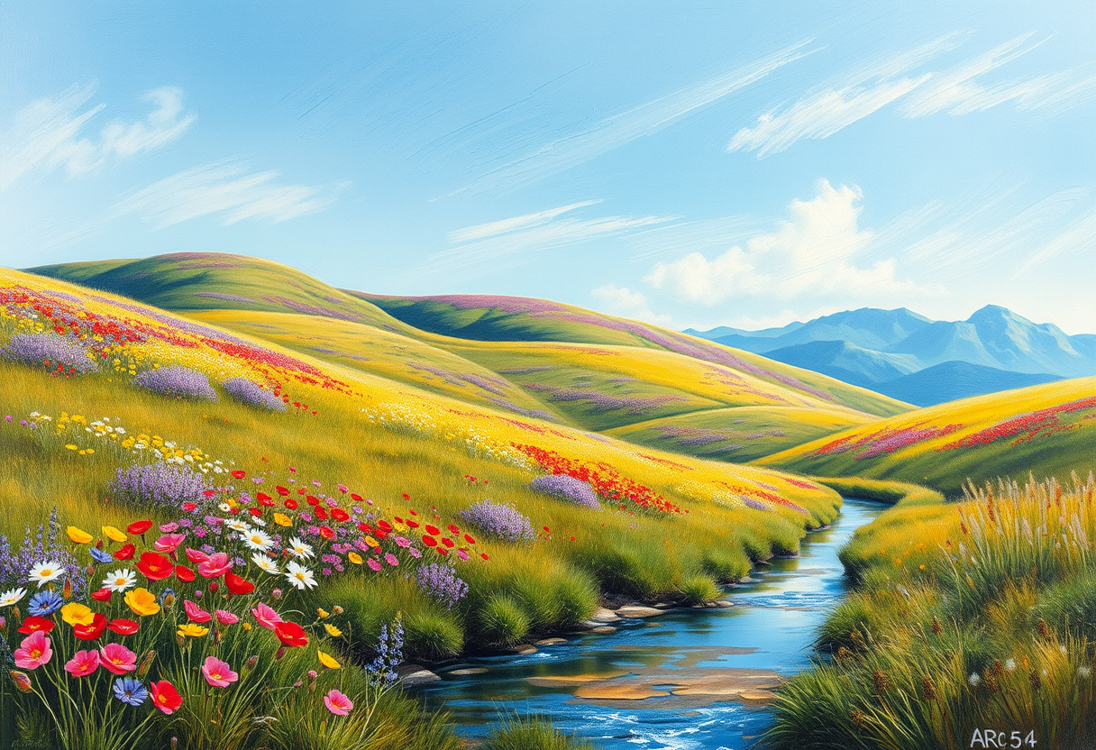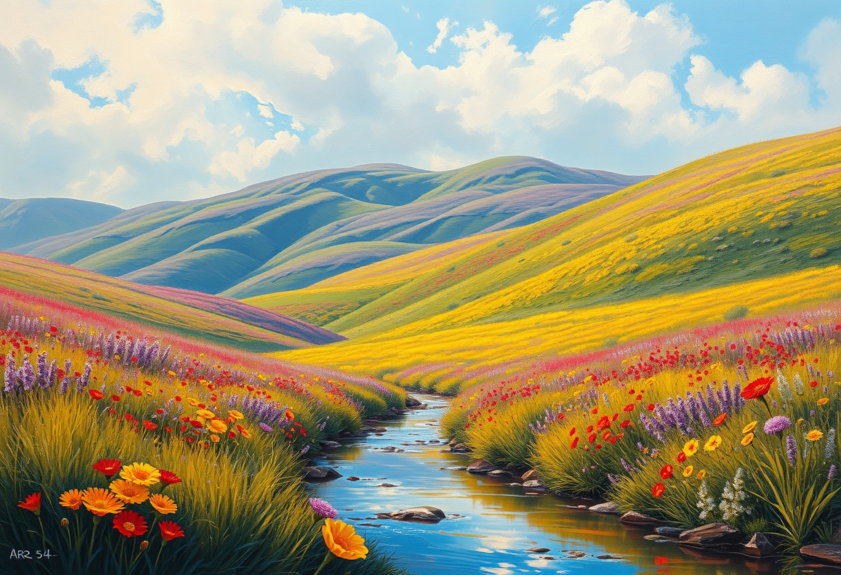 "a beautiful landscape scene, oil painting style, rich thick brushstrokes, classical fine art, museum quality oil on canvas, soft diffused lighting, dreamy ethereal glow, soft pastel color palette, gentle muted tones, highly detailed, rich textures, intricate details"