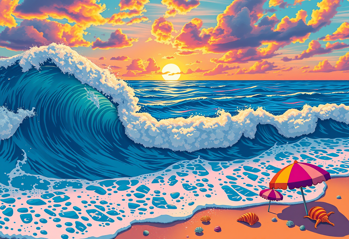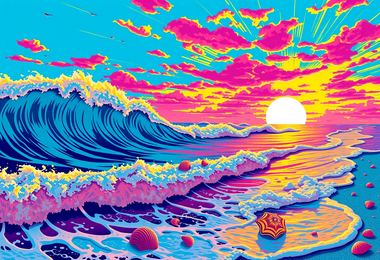 "an ocean seascape, pop art style, bold colors, graphic design, Andy Warhol inspired, high contrast, highly detailed, rich textures, intricate details"