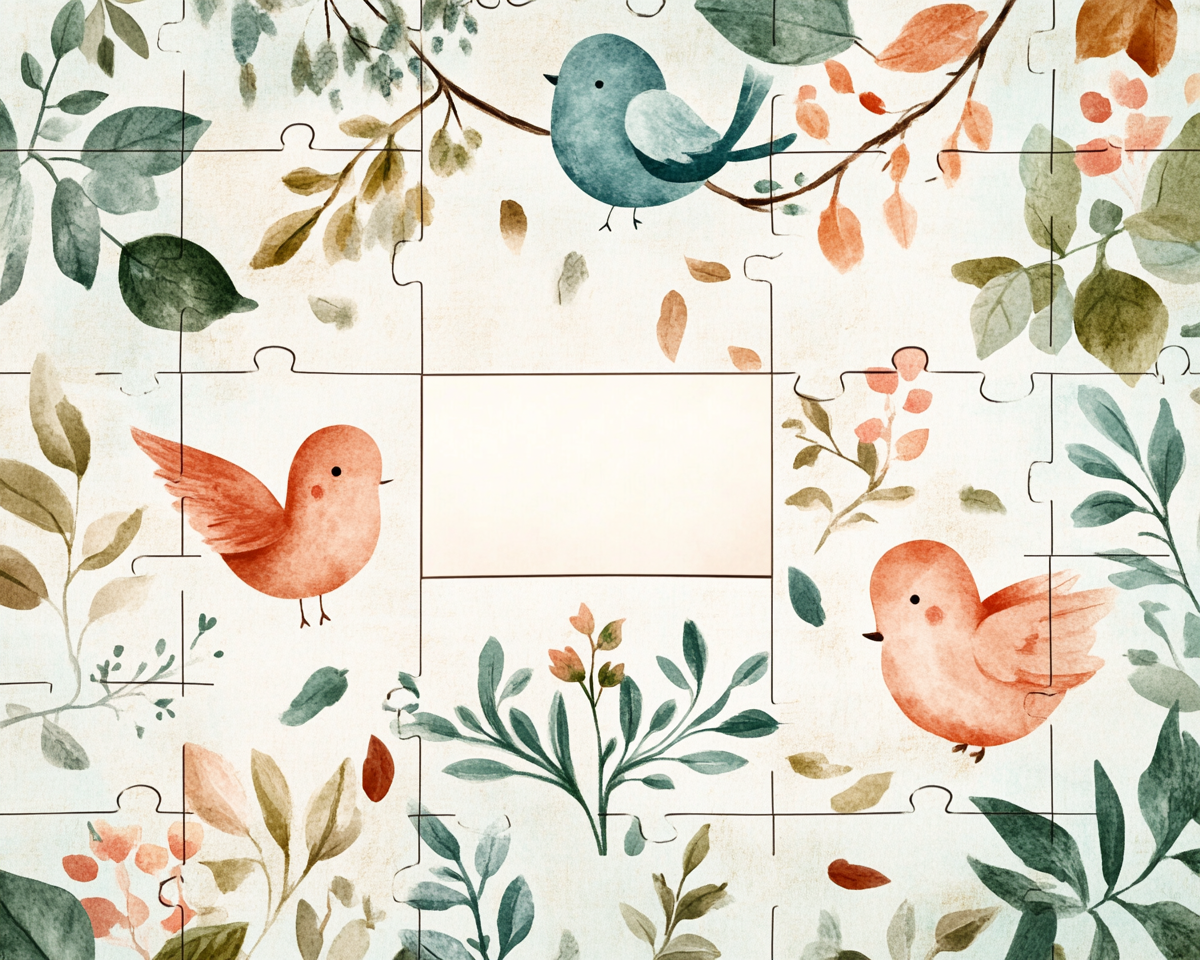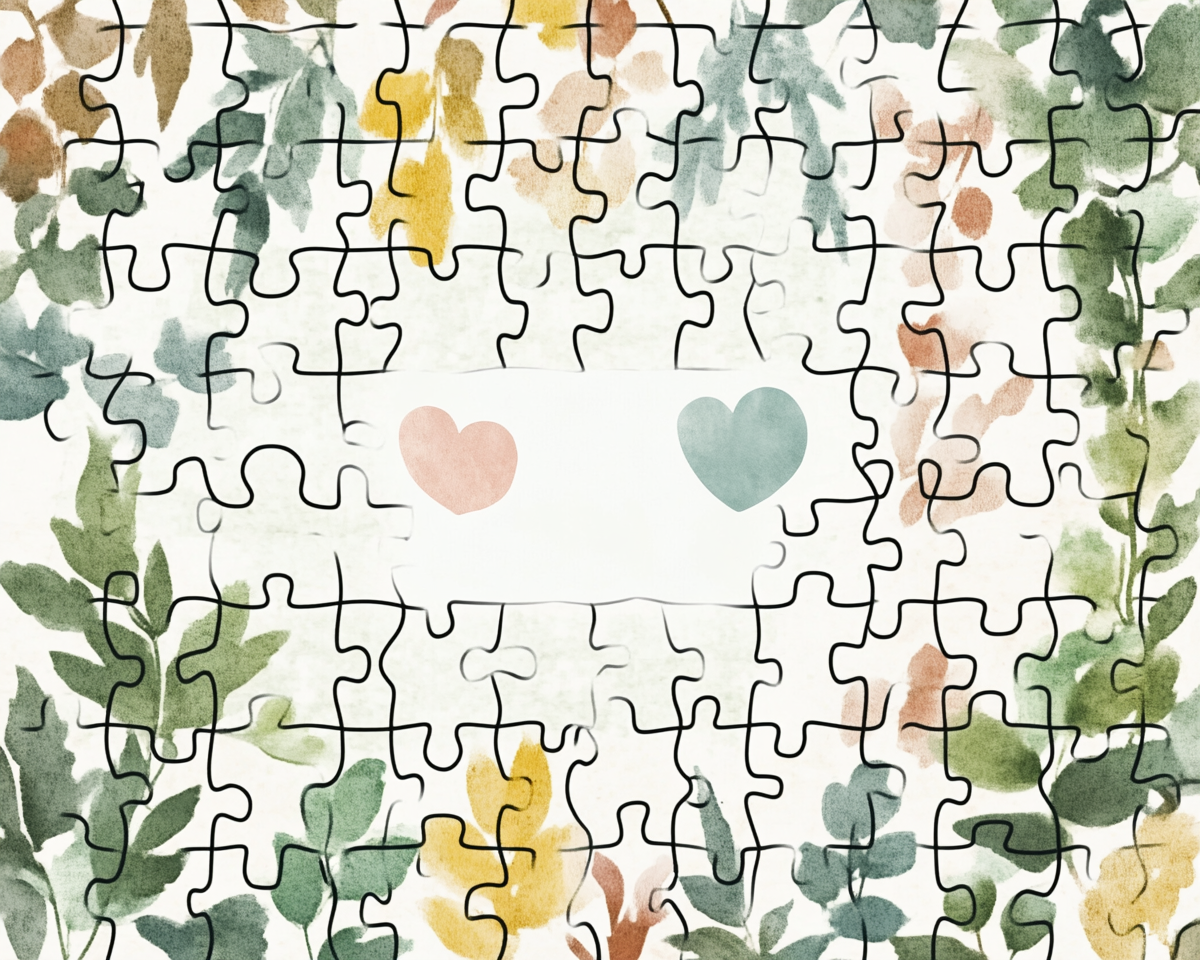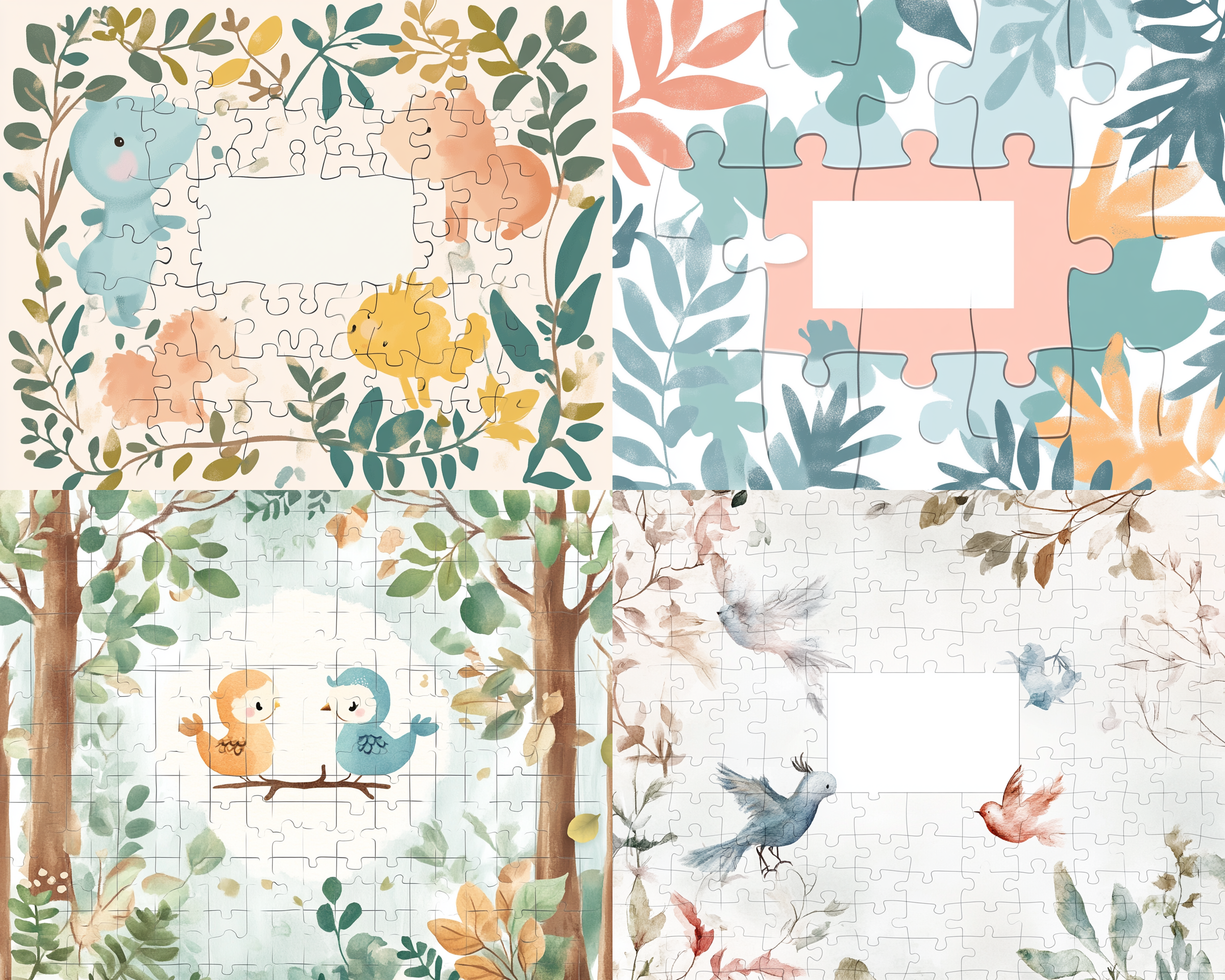"Design a 12-piece puzzle for a baby gender reveal event. The puzzle should have soft, natural tones and feature symbols representing both a baby boy and a baby girl in the center. There should be a blank space in the middle of the puzzle to place the baby's name once it is completed. The puzzle should include subtle elements like leaves, branches, and other nature-inspired details to evoke a peaceful forest theme. The puzzle pieces should be large and easy to assemble, with a calm and gentle color palette."