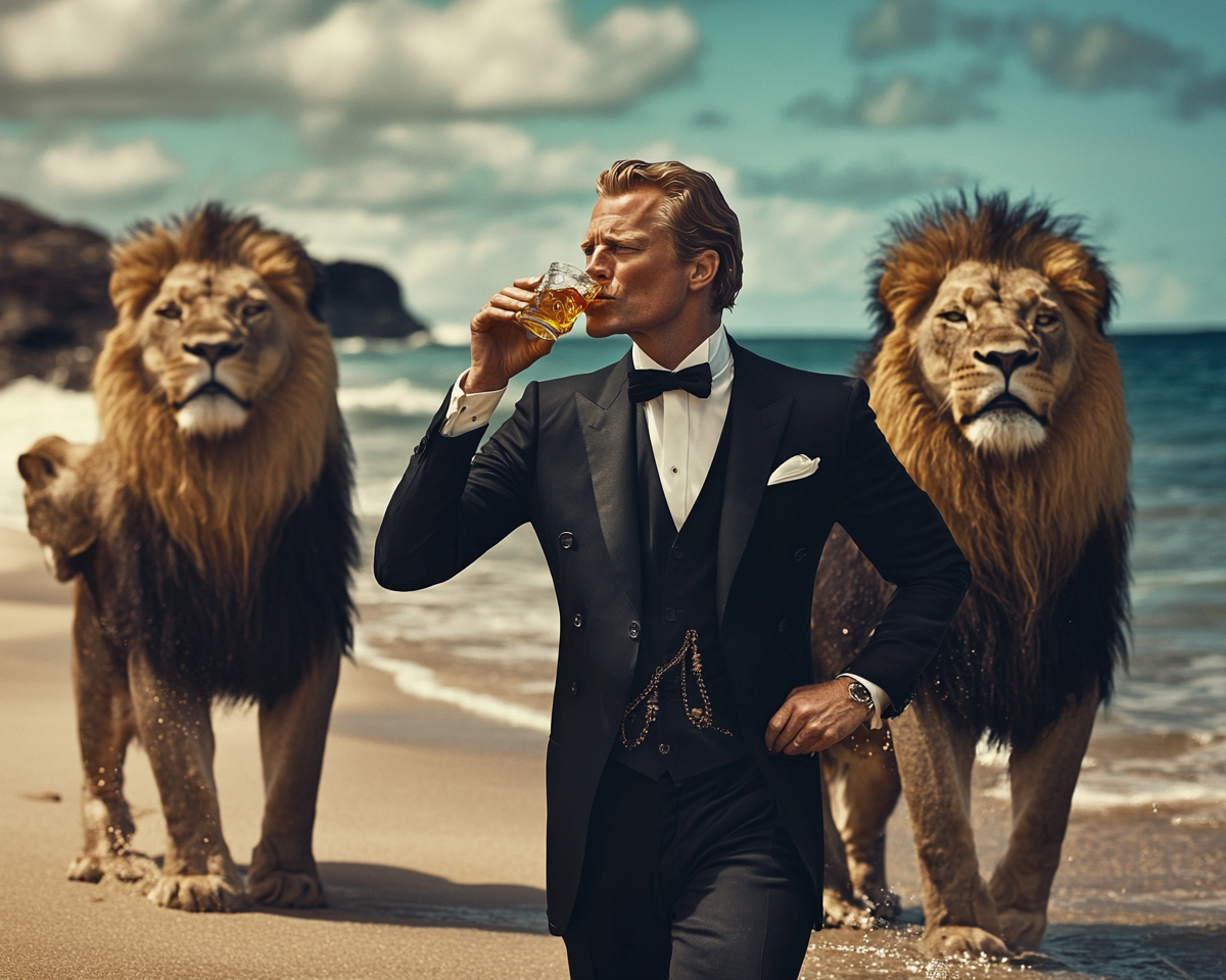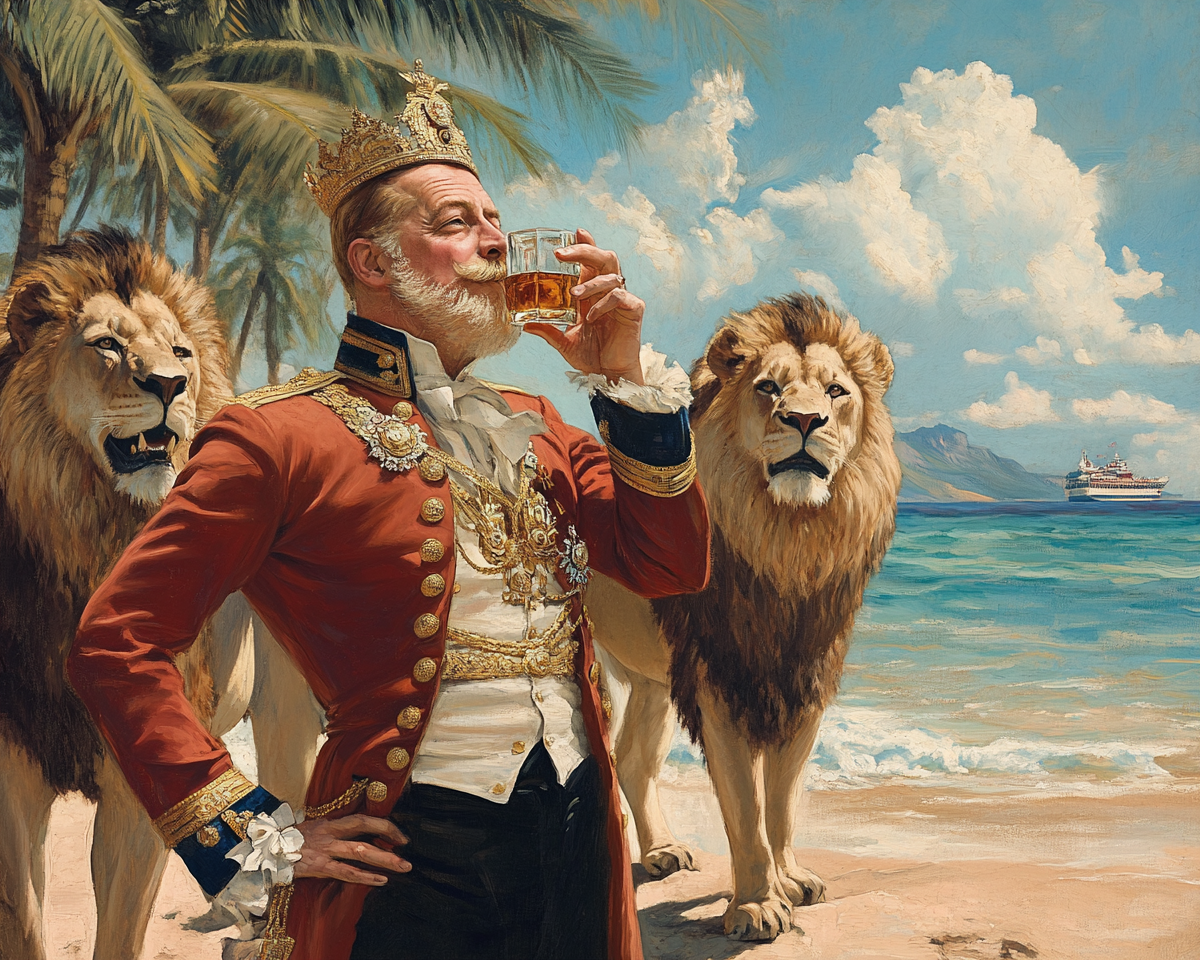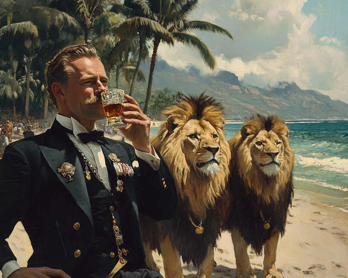 "King Frederik from Denmark drinking shot of whiskey at a beach in hawaii with three lions standing behind him."
