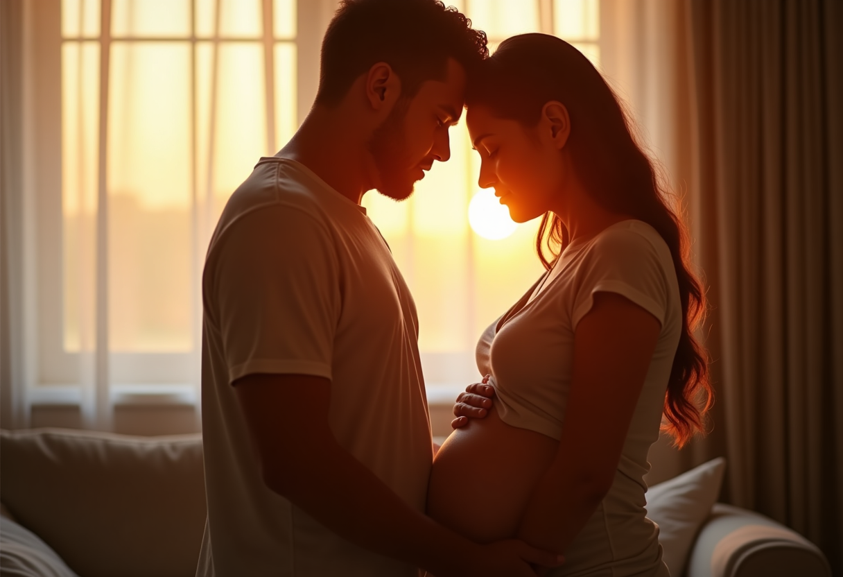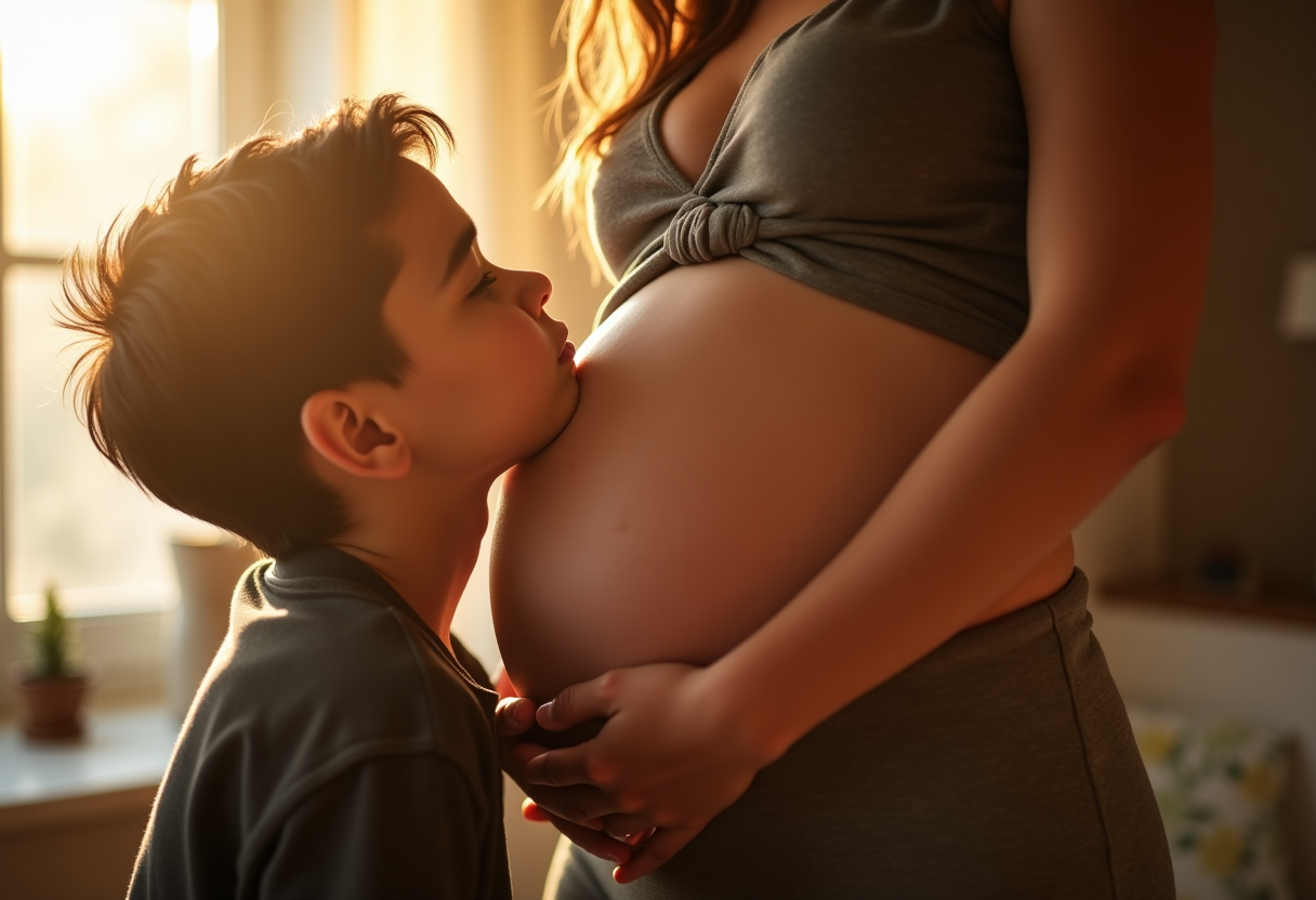 "realistic, high-quality photo of a young man gently kissing the pregnant belly of his partner. Soft, warm sunlight, emotional atmosphere, cozy indoor setting. Aspect ratio 2:3 for A4 portrait format.""