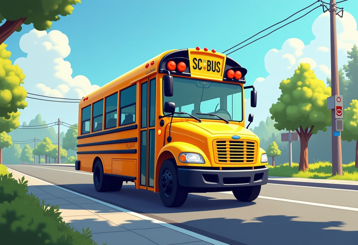 "necesito una imagen de bus escolar que sea animada claro en una carretera "