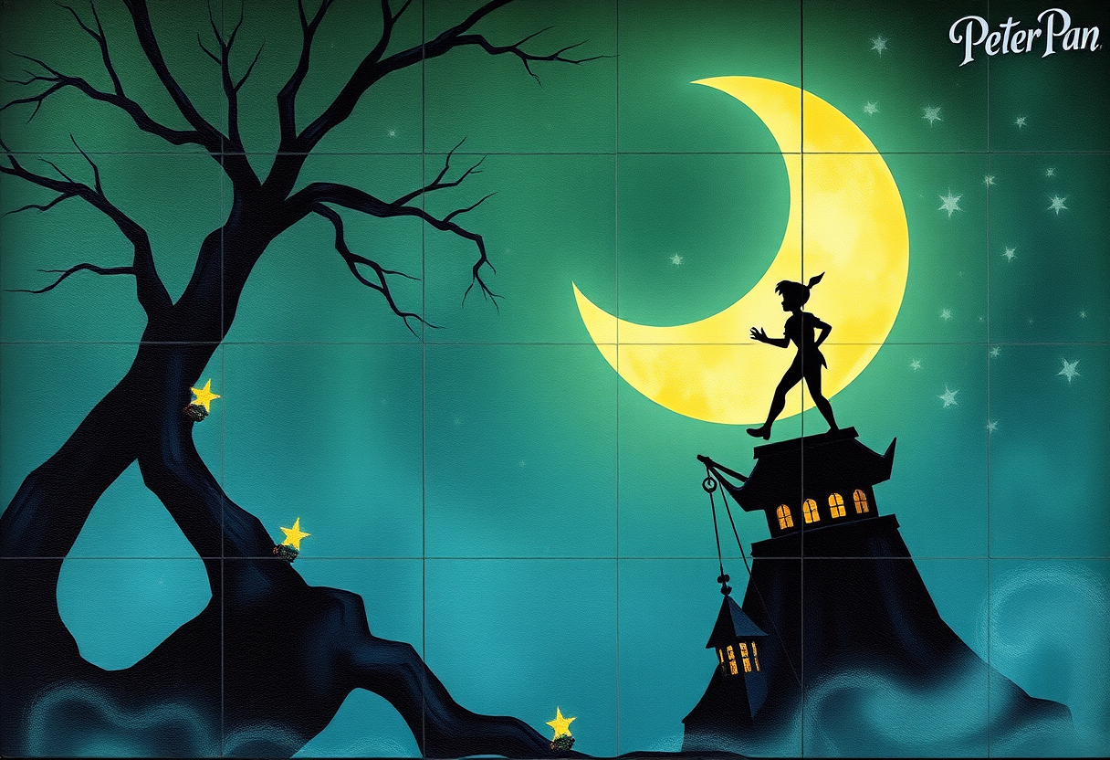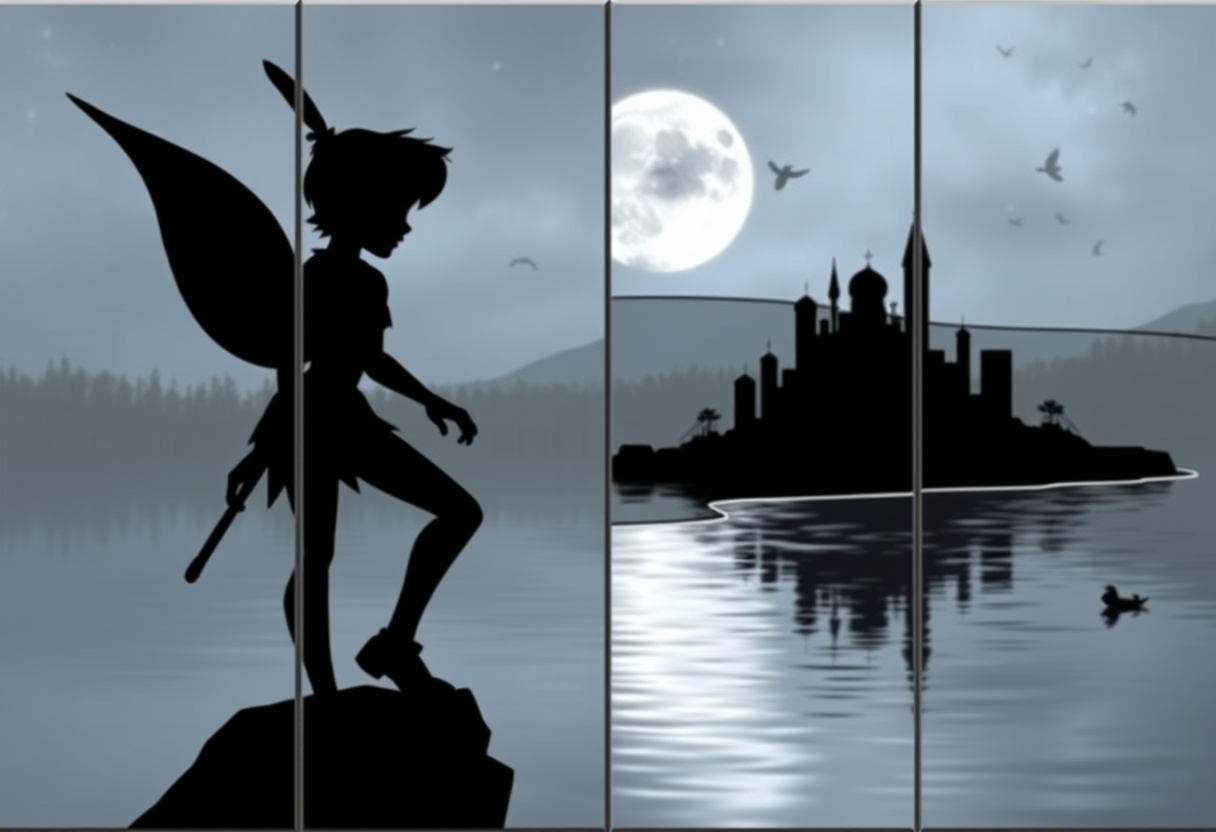 "créer un puzzle de 4-5 pièces non égales sur le thème de Peter Pan à perdu son ombre avec une pièce avec la forme de l'ombre de Peter Pan"