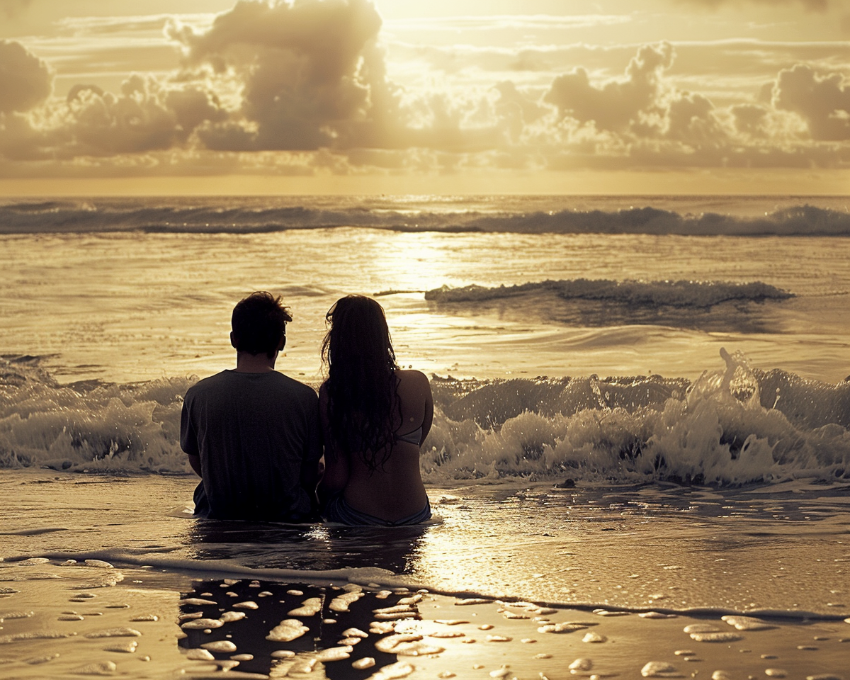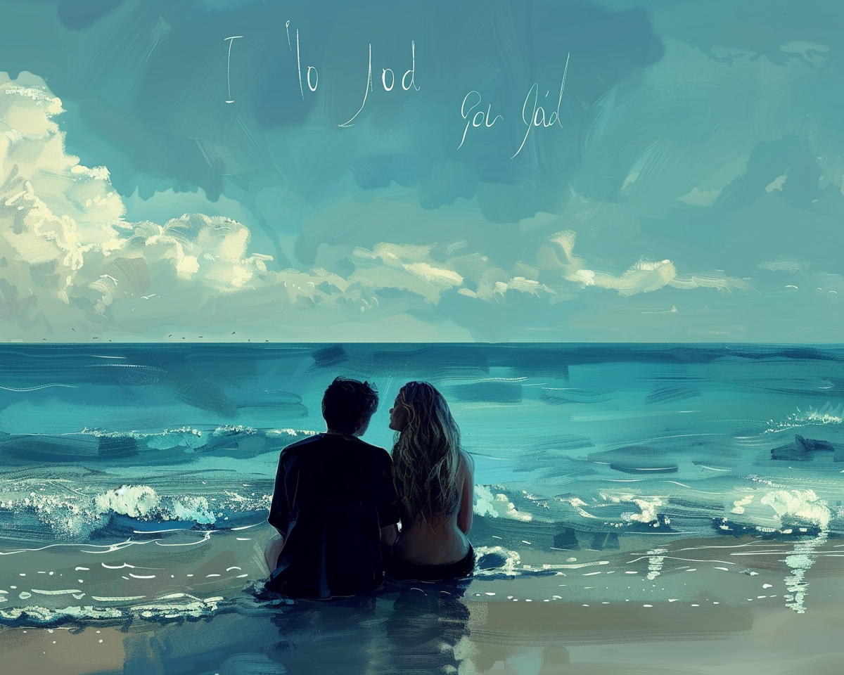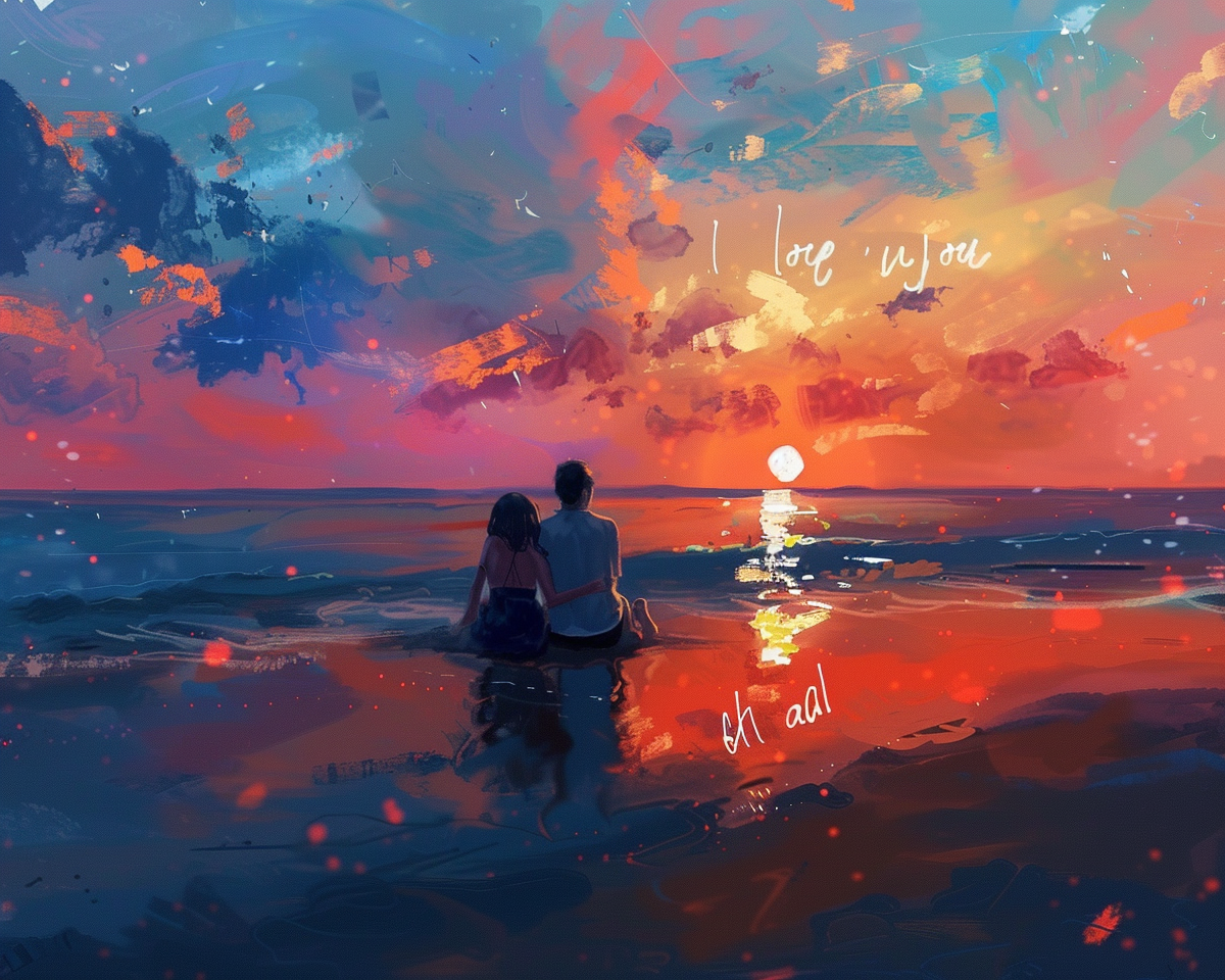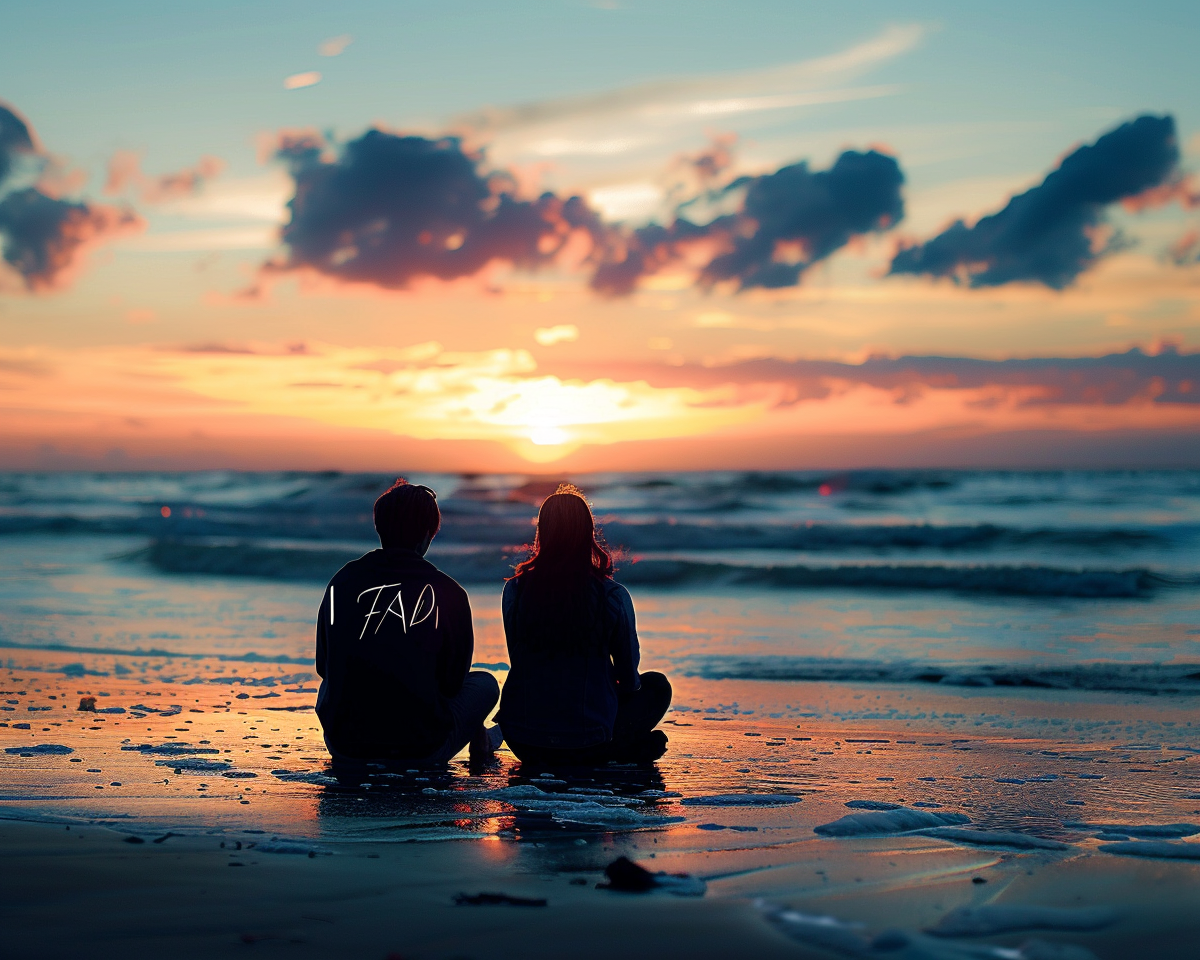 "A picture of two lovers sitting in the beach Enjoying and write this words on the top I love you fadi"